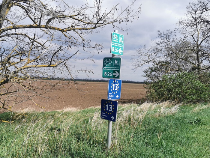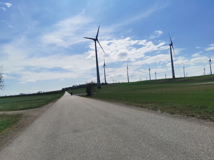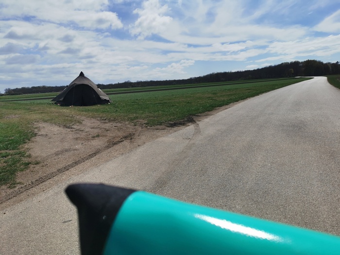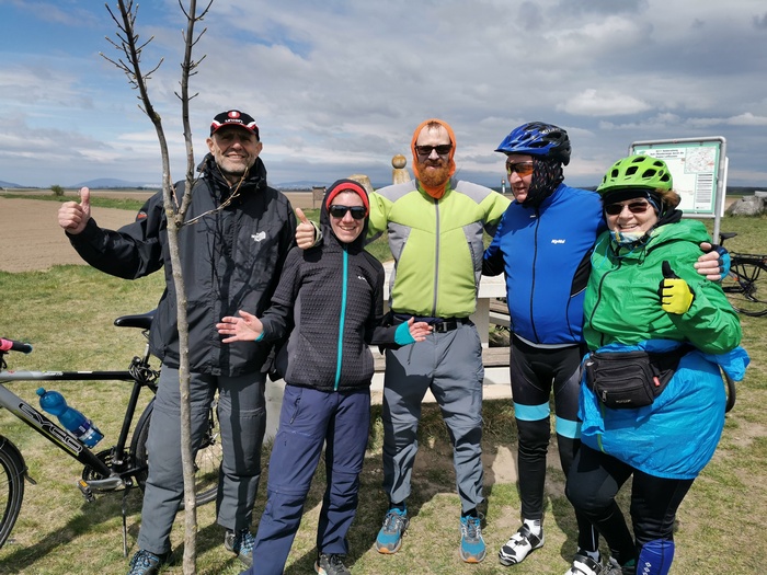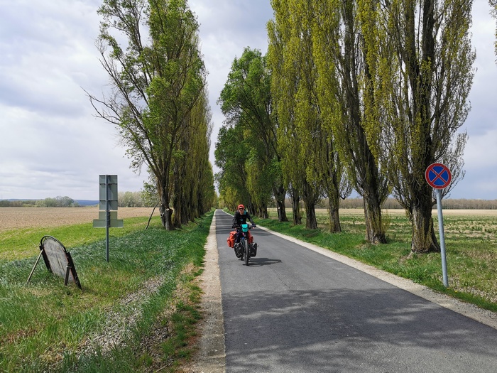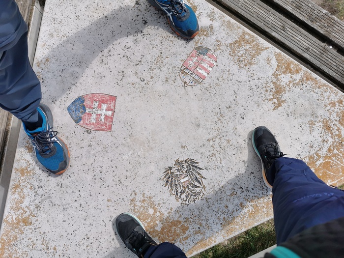 Am Samstag den 16. April verließen wir planmäßig den Lauf der Donau, um Richtung nördliches Burgenland, also zurück nach Österreich, aufzubrechen. Den Neusiedler See ließen wir rechts liegen und bewegten uns überwiegend auf dem Europa-Radweg Eiserner Vorhang. Erneut erlebten wir unfassbar starken Wind, allerdings hatte dieser glücklicherweise gedreht und katapultierte uns somit im Handumdrehen zu unserem Tagesziel nach Pamhagen (AT) direkt an der Grenze zu Ungarn. Der Weg führte uns naturgemäß nicht ständig exakt gen Süden, sodass es bei einigen der Zick-Zack-Passagen durch endlose Felder mal wieder zu absurden Gegenwind-Intermezzos kam, die uns fast zum Anhalten zwangen. Bei einem kurzen Abstecher zum Dreiländereck Österreich, Slowakei, Ungarn trafen wir auf eine Gruppe ungarischer Radtouristen, die sich gar nicht mehr einkriegten, als wir von unseren Reiseplänen bzw. der bereits hinter uns liegenden Etappen berichteten. Ungefragt landeten wir auf einigen Fotos und fühlten uns ein bisschen wie eine Zirkusattraktion.