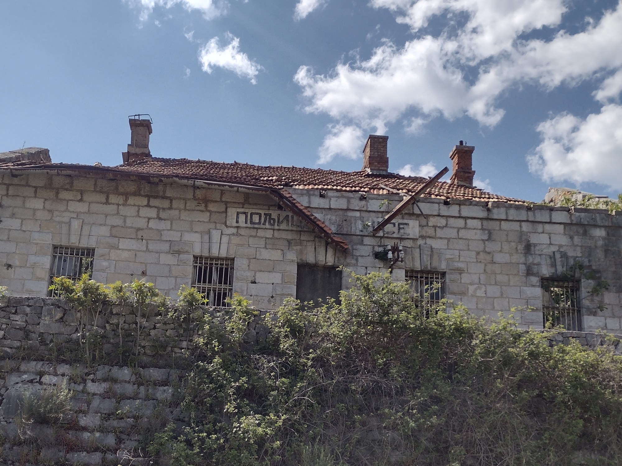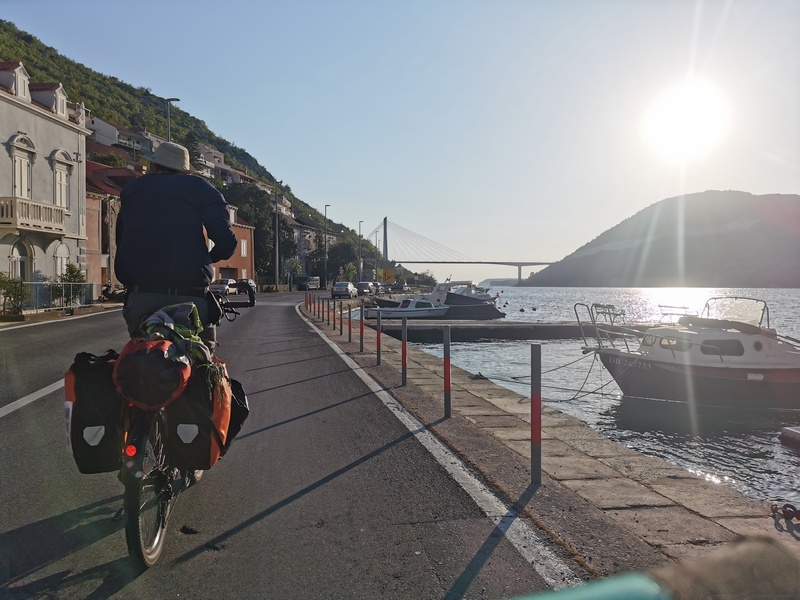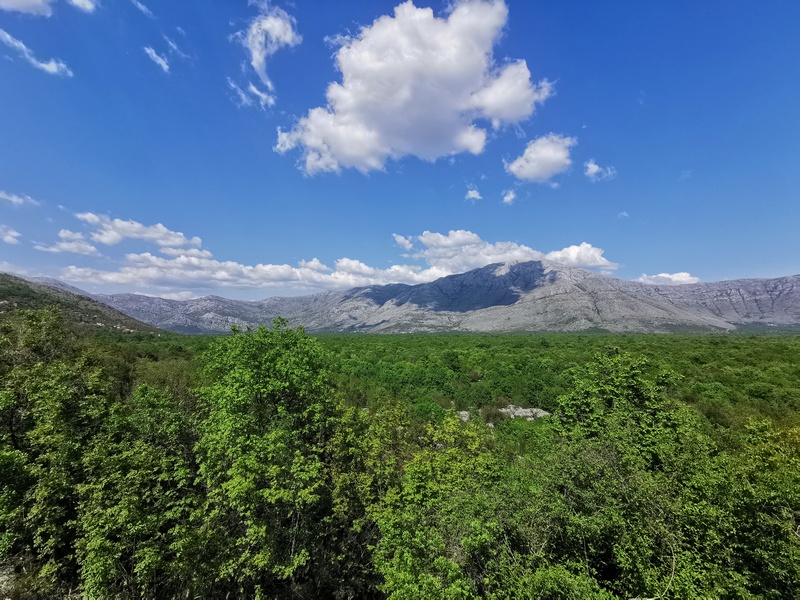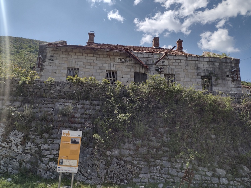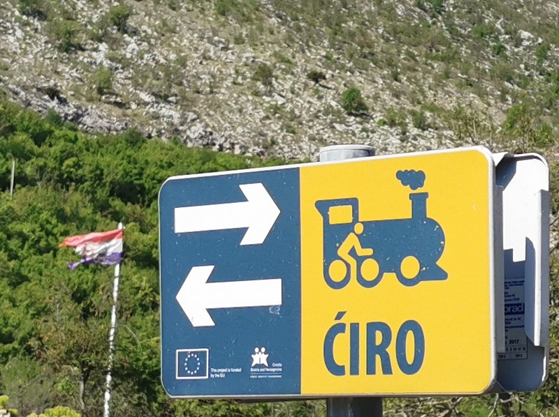 Unser Rastplatz lag über einem großen einzementierten Staubecken, dem künstlich angelegten Vrutak-See, der als Speicherbecken für ein Pumpspeicherkraftwerk genutzt wird. Der See bildet den Beginn des weitläufigen Popovo-Karstfeld (übersetzt „Priesterfeld“), das umschlossen wird von den Dinarischen Alpen. Der Fluss Trebisnjica, der den Vrutak-See speist. schlängelt sich anschließend durch das Popovo-Tal. Um das Absinken des Wassers durch die kleineren Senklöcher im Popovo-Tal zu verhindern, wurde das Flussbett auf einer Länge von 67 km betoniert. Der Ciro-Radweg geht an den Hängen dieses Tals entlang, mit traumhaften Blick in die Ebene. Bei den Orten, die nicht mehr alle bewohnt sind, kann man noch die alten Bahnstationen, die größtenteils verfallen sind, anschauen. Abgesehen von der spektakulären Landschaft, waren die Straßenverhältnisse super und uns begegnete in diesem Abschnitt kein Auto mehr. Mit solchen Radwegen hatten wir auf dem Balkan nicht mehr gerechnet.