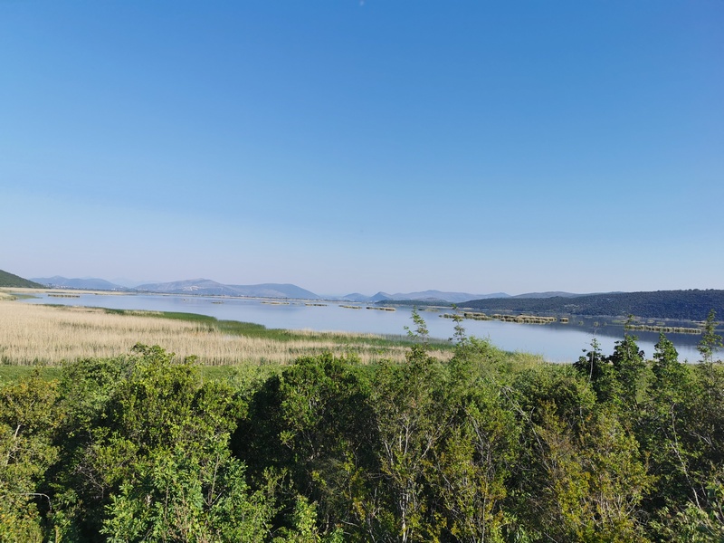 Wir folgten weiter dem Lokomotiven-Radweg (Ciro) Richtung Trebinje. Er führte uns zunächst an dem Svitavsko-See entlang, dessen Uferbereich mit Schilf zugewuchert war. Die Gegend wurde verlassener, nur noch vereinzelte Höfe, die kleinräumig Landwirtschaft betrieben. Dann ging es wieder steil bergauf, was in uns die Frage aufwarf wie dieser Höhenunterschied einst von Dampflokomotiven bewältigt worden sein könnte. Es war strahlend-blauer Himmel, aber noch nicht zu heiß und die Straße war kaum befahren, wir kamen gut Voran. Unsere Wasserreserven neigten sich jedoch auch dem Ende entgegen und wir trafen nur noch selten auf Häuser. Nachdem wir den Anstieg hinter uns gebracht hatten wichen wir an einer Kreuzung vom Radweg ab (der allerdings an dieser Stelle auch nicht ausgeschildert war) und folgten mal wieder komoot, was sich als Fehler herausstellte: Die Straße wurde an dieser Stelle neu gemacht, bestand aber momentan nur als spitzen groben Steinen, teilweise war diese Schotterpiste durch tiefe Furchen unterbrochen, durch die wir Schieben mussten. Zum Glück kamen wir durch diesen kurze Stück unbeschadet hindurch und fragten anschließen im nächsten Dorf einen grummelig blickenden Familienvater, ob wir etwas Wasser an seinem Außenhahn zapfen könnten. Er ließ uns gewähren, auch wenn er nicht sehr begeistert schien.