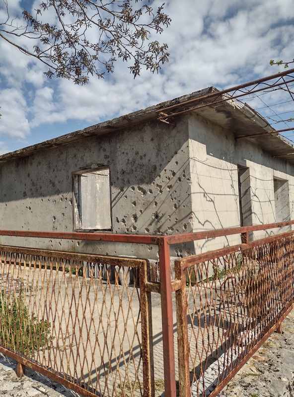 Die Begeisterung über die Landschaft half uns den Hunger zu ignorieren. Als wir jedoch in einem Dorf eine fröhliche Runde vor ihrem Haus sitzend kaffeetrinkend sahen, hielten wir an, um zu fragen, ob sie uns nicht ein Brot verkaufen könnten (für kroatische Kuna, der Grenzübergang in Ivanica war nun, für Autofahrer*innen in greifbarer Nähe). Doch die zwar sehr freundliche Damen ging nicht darauf ein, sondern riet uns zum nächsten Laden in 11 Kilometern aufzusuchen. Wir plauderten trotzdem noch kurz mit ihr, als wir die Schönheit der Landschaft lobten, stimmte sie uns zwar zu, stellte aber klar, dass es in ihrem Dorf nicht mehr so sei, wie vor dem Krieg. Als wir um die nächste Ecke bogen, wurde uns klar, warum sie dies so deutlich betont hatte. Der Ort war Größtenteils noch immer zerstört und nur wenige Häuser bewohnt.