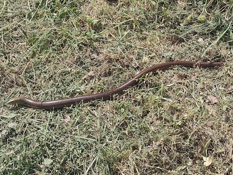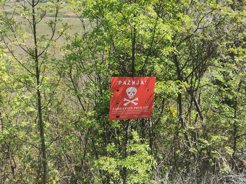 Ein paar Kilometer nach unserer Rast kam dann jedoch der Abzweig: Der Radweg führte weiter durch Bosnien, wir konnten jetzt aber abbiegen, um über die Grenze nach Kroatien zu kommen (gemäß komoot gibt es einen Grenzübergang bei Dobri Do). Die Entscheidung war also: Lieber sich baldmöglichst Essen besorgen oder lieber auf diesem tollen Radweg weiterfahren (und erst in 50 Kilometern Geld und Lebensmittel bekommen). Wir entschieden uns für den Radweg! Und waren sehr zufrieden mit dieser Entscheidung, zumindest für die nächsten 30 Kilometer. Das weitläufige Tal wollte gar nicht enden und die Landschaft wurde immer schöner. Zunächst war es etwas eintönige Agrarlandschaft, die jedoch nach und nach einem dichten Wald wich, durchbrochen von Hügeln und Felsen. Kühe lugten zwischen den Bäumen hervor und im Gebüsch raschelten Schlangen (An alle professionellen und Hobby-Biologen: Siehe Foto, wir freuen uns über die Artbestimmung), deren Weg auch häufig unseren Weg kreuzte. Da sie aber mehr Angst hatten vor uns, als wir vor ihnen, machten wir uns um ihretwegen keine Sorgen. Etwas furchteinflösender waren die Schilder mit Totenköpfen und der Aufschrift „Paznja! Zabranjen Prolaz!“ – „Beachtung! Verbotener Durchgang! Das Betreten dieses minengefährdeten Gebiets ist eine Straftat.“, die teilweise den Wegesrand säumten. Auch ohne Strafandrohung hätten wir diese Gebiete nicht betreten wollen.