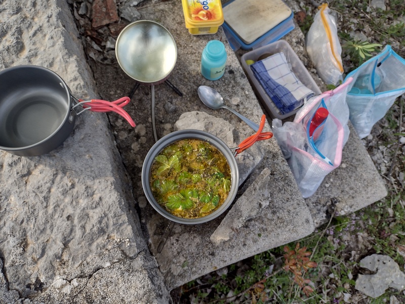 Ein Stück hinter dem Ort legten wir schließlich an einem dieser zerfallenen Häuser noch eine Rast ein, Julia sammelte Brombeerblätter, Salbei, Thymian und Rosmarin und Tilmann kochte daraus (ergänzt mit Margarine, Senf, Chillisoße und Salz) eine aufbauende Kraftbrühe. Nun standen uns wirklich nur noch wenige Kilometer bis zu Grenze bevor. Die Fahrt dorthin unter der brennenden Nachmittagssonne war dennoch anstrengend und der staubige Grenzort überzeugte einzig und allein mit der wahnsinnigen Aussicht auf die Adria.
