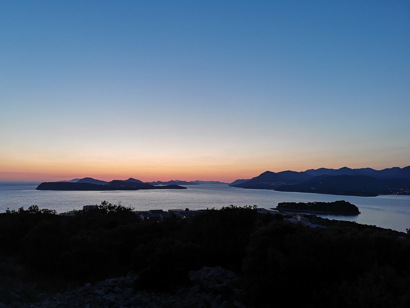 Nach einem Besuch eines Geldautomaten und eines Supermarktes fuhren wir schließlich den Campingplatz an, der zwar geöffnet war, allerdings kein Erbarmen hatte: Wir sollten mit unserem Zelt den gleichen Preis zahlen wie ein Camper und zwar 40 Euro für die Nacht. Diese Ansage fanden wir so dreist, dass wir auf dem Absatz direkt wieder kehrt machten. Wütend traten wir noch einmal in die Pedale einem Schild zu einem weiteren Campingplatz folgend, und blickten nun über die wunderschöne Bucht, die im Sonnenuntergang funkelte. Der Ausblick bewog uns schließlich den Campingplatz in den Wind zu schlagen, sondern bis auf die Anhöhe „Babin Kuk“ hinaufzufahren, um die tolle Aussicht zu genießen und mit einem kleinen Fünkchen Hoffnung, dort einen versteckten Platz für unser Zelt zu finden. Wer rechnet heutzutage noch damit, in einer touristischen Stadt wie Dubrovnik auch nur einen Flecken zu finden, der nicht mit Bars, Cafés, Hotels, Restaurants und vielen Touristen zugepflastert ist? Wir jedenfalls nicht, wurden dann aber eines besseren belehrt. Auf der Anhöhe befand sich eine Brachfläche, die nur über einen Pfad zugänglich war, ein zerfallenes Gemäuer stand dort im hohen Gras und keine Menschenseele weit und breit. Der perfekte Zeltplatz für uns, mit Blick über das Meer und die vorgelagerten Inseln. Wir konnten es kaum fassen, aßen uns zufrieden satt und schlüpften in unser Zelt.