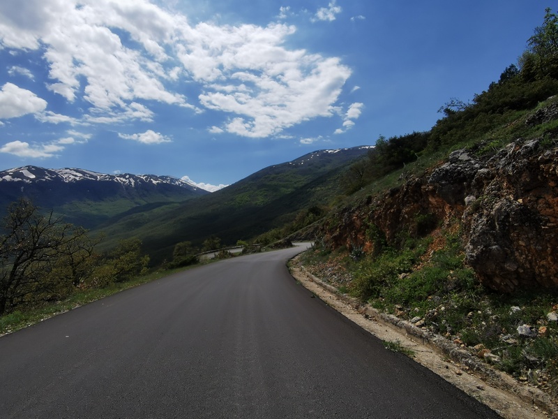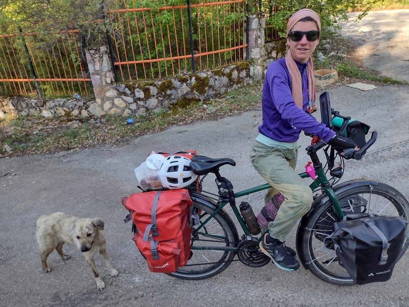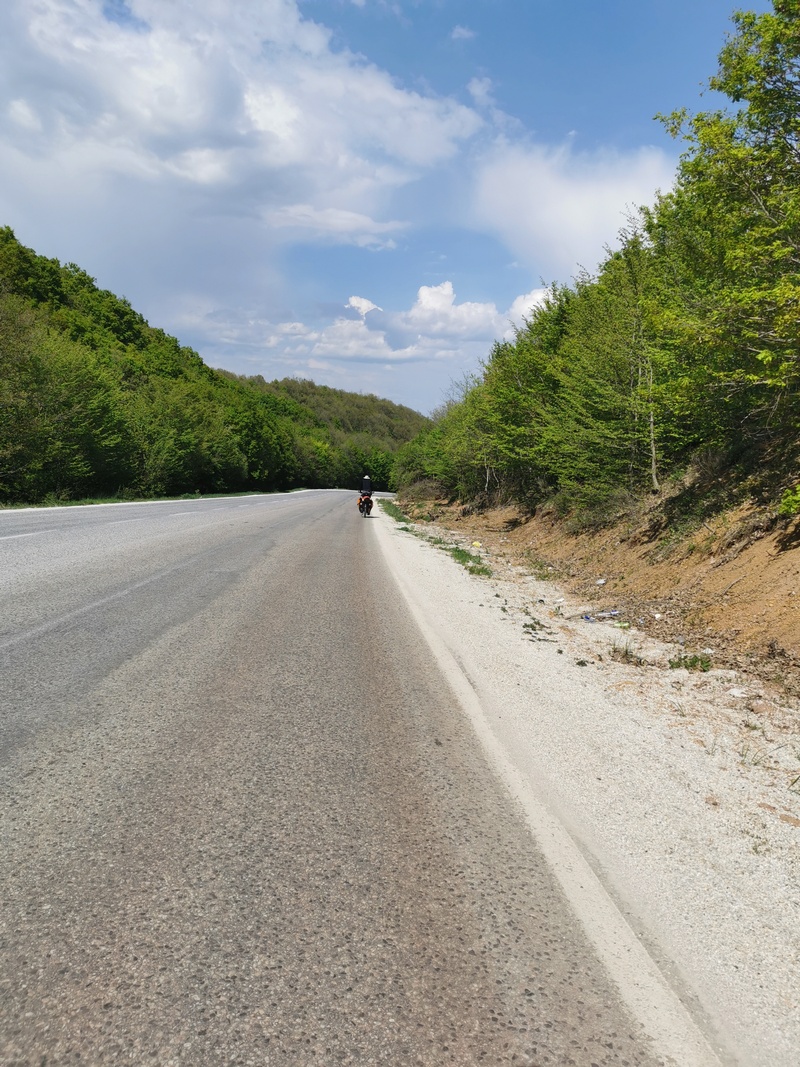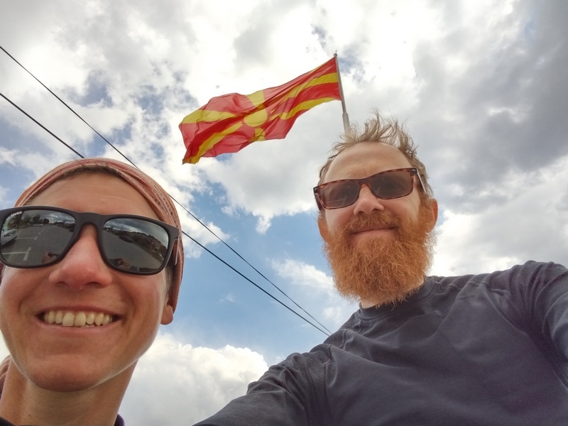 Hinter Bitola war es nun nicht mehr weit zur Grenze. Unsere Navigations-App hatte uns einen Weg entlang der schnurgeraden Hauptstraße A3 vorgeschlagen. Als wir eine kleinere Straße die einige Kilometer weit westlich verlief wählten, gab es bezüglich des Grenzübergangs keine Bedenken seitens des Algorithmus, sodass wir diesen Weg zunächst tatsächlich einschlugen. Vor der letzten passablen Verbindung zwischen beiden Straßen fragten wir jedoch vorsichtshalber noch einmal an einem auffallend schmucken Haus mit ordentlichem Garten (Hauptsache gepflegt!) und wurden belehrt, dass der Grenzübergang nur über die A3 möglich sei. Jedoch bestand der Eigentümer der Immobilie noch darauf unsere Wasserflaschen vor unserer Weiterfahrt befüllen zu dürfen. Als wir dann wieder in die Pedale steigen wollten öffnete sich nun auch noch die Tür des Hauses vor dem wir unsere Räder geparkt hatten. Die Bewohnerin wollte uns nämlich noch eine gute Reise wünschen und drückte uns jeweils einen grünen Apfel und ein Eukalyptus-Bonbon in die Hand. Danach kamen wir über die schnurgerade und erfreulich wenig stark befahrene A3 bei strahlendem Sonnenschein im Handumdrehen zur Grenze nach Westmazedonien.