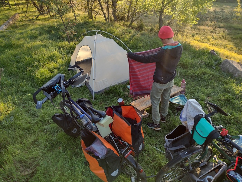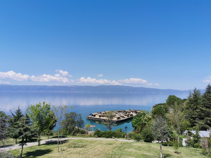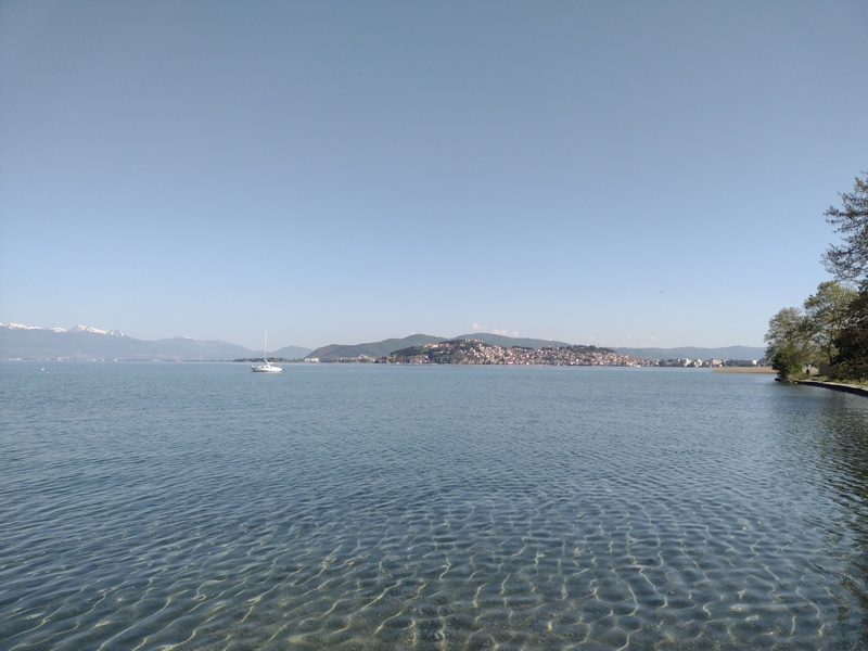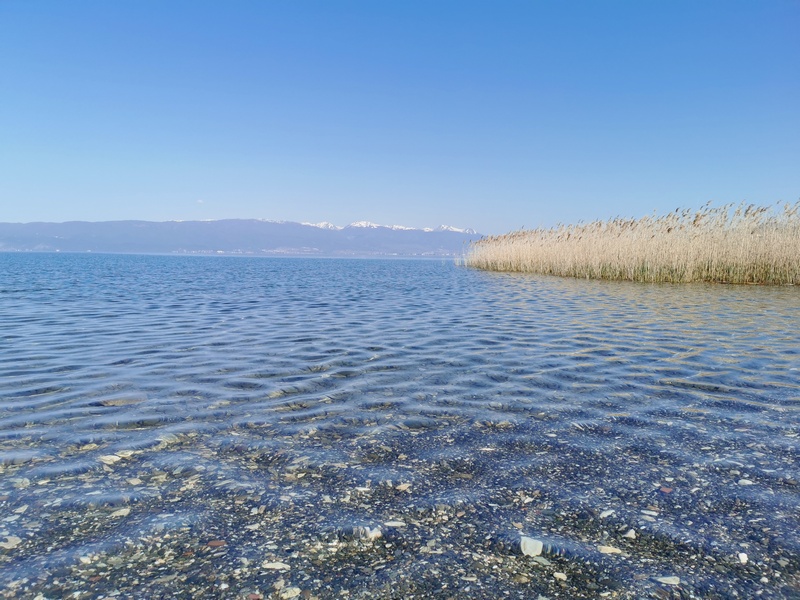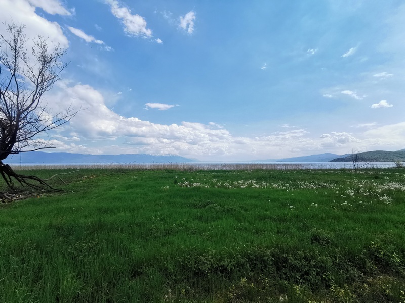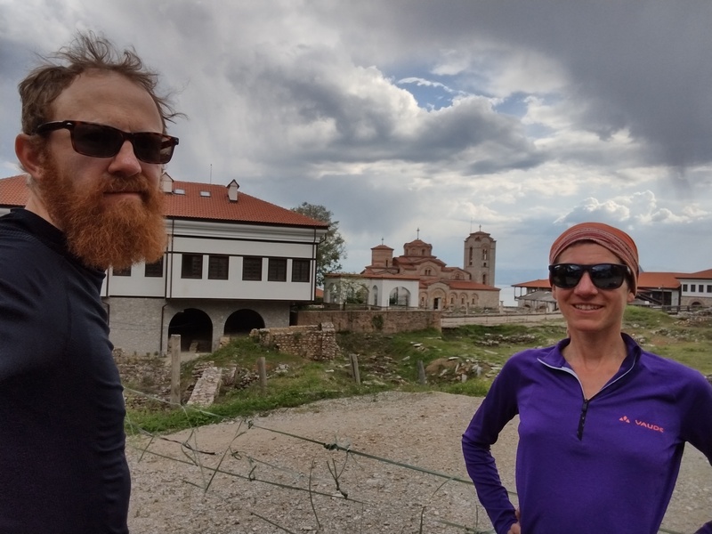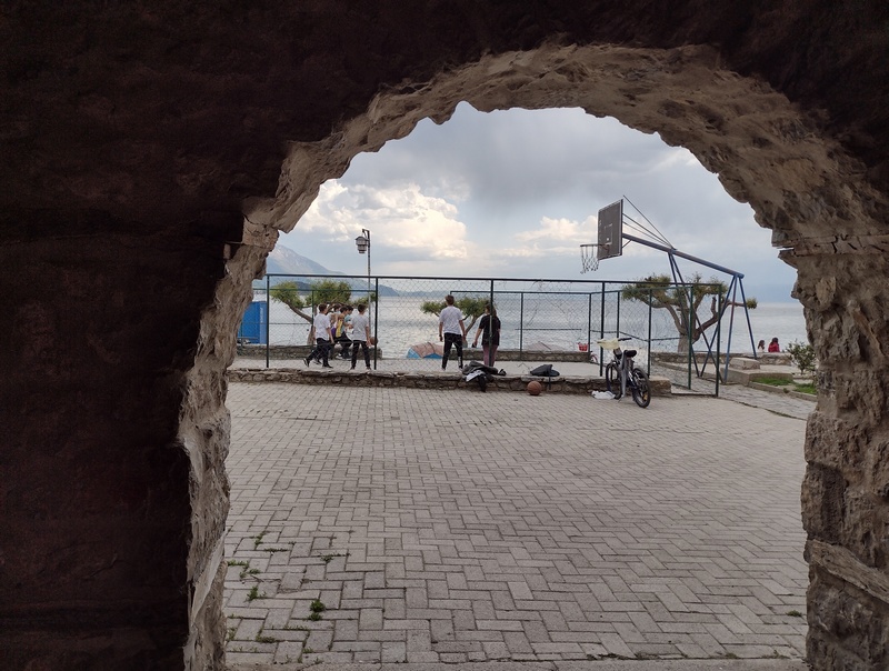 Am Ende der Abfahrt erstreckte sich der riesige Ohrid-See vor uns, einer der ältesten Seen der Erde und ebenfalls UNESCO-Welterbe, der von Bergen mit schneebedeckten Gipfel umrandet wird. Wir stießen zunächst an sein nördliches Ufer, wo die Küste flach und mit Schilf bewachsen und alsbald mit viel touristischer Infrastruktur zugepflastert ist. Die gleichnamige Stadt Ohrid wollten wir uns trotz steilem Anstieg nicht entgehen lassen und konnten viele antike, byzantinische und osmanische Gemäuer bewundern während wir über Kopfsteinpflaster durch die Altstadt hoppelten. Uns entgingen auch nicht die Perlenverkäufer, die eine Art Wahrzeichen der Stadt sind. Doch am besten gefiel uns, dass der Basketballplatz von Ohrids Kindern mitten in der Altstadt nicht der touristischen Infrastruktur weichen musste. Im neuen Teil der Stadt reiht sich ein Restaurant neben das andere, wir suchten allerdings nur den Supermarkt auf und freuten uns über das reichhaltige Angebot an veganen Speisen, das wir in den vorher bereisten Ländern vermisst hatten. Mit vollgepackten Taschen machten wir uns auf die Suche nach einem Schlafplatz, nicht bevor wir erstmalig die eigens mitgeführte Rohrzange zur Beschaffung von Trinkwasser einsetzten (natürlich achteten wir darauf den Wasserhahn nach der Wasserbeschaffungsmaßnahme nicht zu sehr zuzuknallen). Kurz hinter der Stadt wurden wir fündig. Direkt am See hinter einem brachliegenden Gelände, dass mit einem massiven Sperrholzzaun eingehaust war, fühlten wir uns gut versteckt. Als wir jedoch mit dem Kochen und dem Zeltaufbau begannen, merkten wir schnell, dass hier eine beliebte Strecke für Abendspaziergänger*innen sowie kiffende Jugendliche war. Außerdem stellten wir fest, dass direkt um die nächste Ecke der nächste Zeltplatz war. Trotzdem störte sich keiner an uns, sondern alle grüßten mit einem freundlichen „Dobre vece“. Langsam haben wir uns daran gewöhnt, dass Wildzelten, als etwas ganz normales akzeptiert wird und wir bisher noch keinerlei Schwierigkeiten deswegen hatten. Das Geräusch der Wellen des Ohrid-See wiegte uns sanft in den Schlaf.