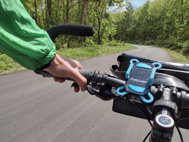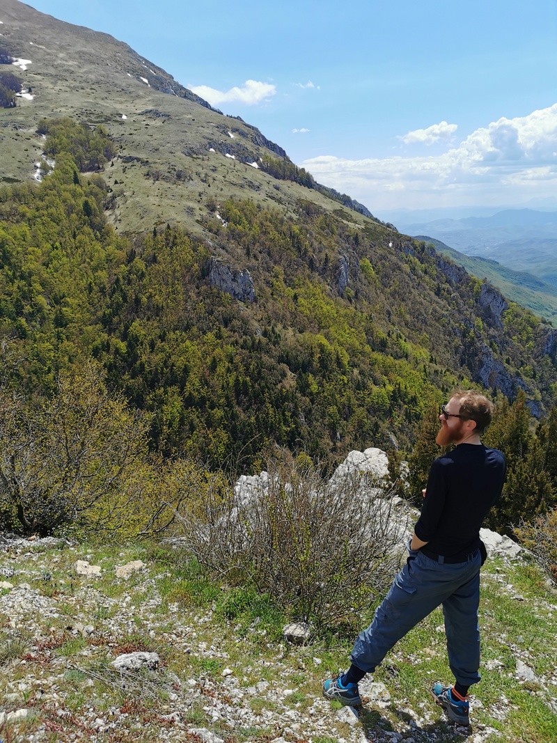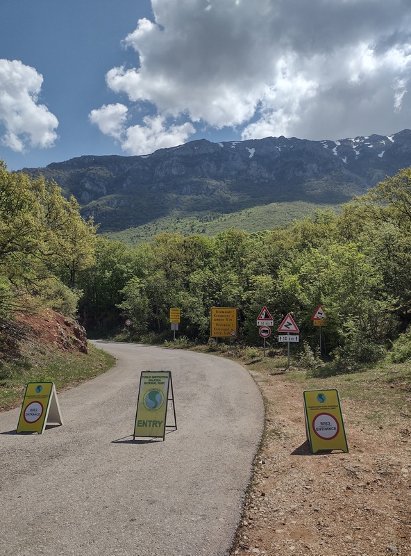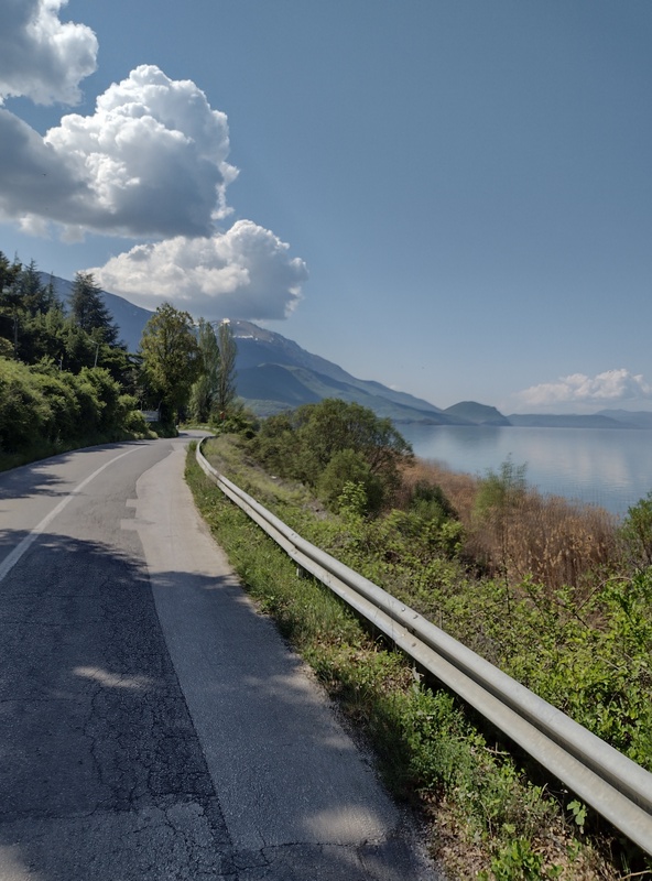Am nächsten Morgen lag der See still vor uns und wir studierten die digitale Karte, um uns mit der weiteren Route vertraut zu machen. Diesen Abschnitt hatten wir bereits vor geraumer Zeit grob geplant und uns zuletzt nicht mehr intensiver mit ihr beschäftigt. Wir waren davon ausgegangen nur einen kurzen Abstecher von einem Tag nach Nordmazedonien zu machen und dann nach Griechenland weiter zu reisen. Jetzt stellten wir fest, dass das so ohne Weiteres gar nicht ging: Wir müssten entweder nochmal nach Albanien einreisen, oder noch einmal ein Stück bis Ohrid zurück fahren oder über einen 1640 m hohen Pass, auf der Durchquerung des Galicica-Nationalparks. Ohne genau zu wissen, was auf uns zukommt, entschieden wir uns für den Berg – ein Bauchgefühl sagte uns, dass sich das lohnen würde und auch der Kellner im Café bestätigte uns, dass die Straße gut befahrbar und die Aussicht schön sein würde. Die Serpentinen und das Höhenprofil sprachen zwar eine deutliche Sprache, aber die nördliche Variante verlief entlang einer Hauptstraße und noch einmal nach Albanien zurück wollten wir auch nicht. Die in versprochene schöne Aussicht war wahrhaft eine Untertreibung – denn soe war einfach bombastisch! Doch diese mussten wir uns hart erarbeiten: Zunächst ging es bergauf, bergab noch ein Stück weiter am Ohrid-See entlang, der an seinem östlichen Ufer weniger stark besiedelt, stattdessen bewaldet und felsig ist und türkisblaues Wasser in kleinen Buchten hat. Auch eine altes Fischerdorf auf Pfählen konnten wir dort entdecken. Wir waren sehr zufrieden mit unserem Entschluss, auch als wir in Richtung der Berge abbogen. Die Straße war gut zu fahren, es gab nur wenig Verkehr und die Landschaft und Fauna begeisterte uns. Bald kam der Abzweig, an dem eine Straßensperre darauf hinwies dass wir nun den Galicica-Nationalpark betreten. Der Wärter winkte uns durch, offenbar konnten wir wieder einmal vom Bikepacker-Bonus profitieren. Wir arbeiteten uns in das namensgebende Gebirge hinauf und bekamen mit jeder Serpentine mehr eine noch beeindruckendere Aussicht. Wir mussten nun 840 Höhenmeter erklimmen. Bei unserem Aufstieg lieferten wir uns ein kleines Rennen mit den Nationalpark-Baumpflegern, die immer wieder anhielten, um den Weg von herabhängenden Ästen freizuschneiden.