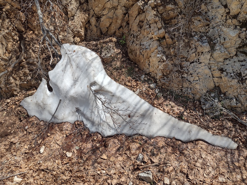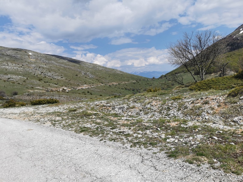Auf zwei Drittel der Strecke übermannte uns der Hunger und die Kräfte ließen nach. Doch kein geeigneter Rastplatz war in Sicht, wir schleppten uns noch etwas weiter und setzen uns dann doch in den Schatten an den Wegesrand und aßen schnell einen Zuckerblock (türkisches Nougat), da kein Hühnerbein aufzutreiben war. Danach war uns zwar schlecht, aber wir hatten genug Energie für den restlichen Aufstieg. Als wir um die nächste Ecke bogen, war es wie so oft, wenn man gerade auf ungemütlichen Steinen gevespert hatte: Ein wunderbarer komfortabler Rastplatz lag dort. Immerhin konnten wir an der dort gelegenen Quelle noch unsere Wasserflaschen auffüllen. Schließlich passierten wir sogar noch ein letztes Fleckchen Schnee, das in einer schattigen Ecke tapfer der Sonne trotzte. Auf dem Pass angekommen bewunderten wir den südlich des Passes gelegenen Gipfel des Marapo (2255 m) und staunten beim Blick zurück wie wir fast senkrecht den Berg hinaufgeklettert waren. Nachdem wir den Pass überwunden und noch einmal den Ohrid-See in seiner vollen Pracht bewundert hatten, ging es auf der anderen Seite bergab Richtung Prespa-See, auch hier eine grandiose Aussicht auf See und Berge. Natürlich gefiel uns diese Aussicht viel besser, denn wir konnten sie gemütlich im Rollen bestaunen und nicht während dem mühseligen Hochstrampeln. Allerdings konnten wir diese nur 20 Minuten bewundern, bei der Auffahrt auf der anderen Seite, hatten wir vier Stunden Zeit die Aussicht zu genießen.