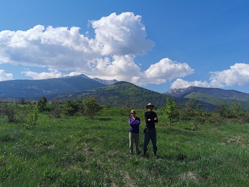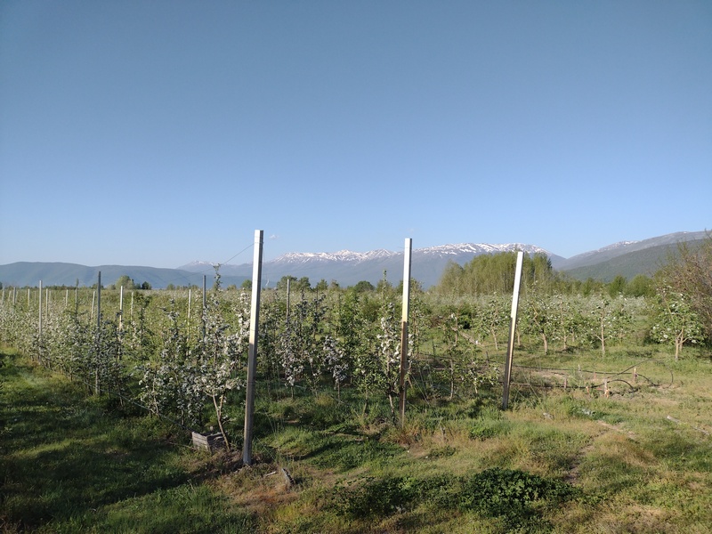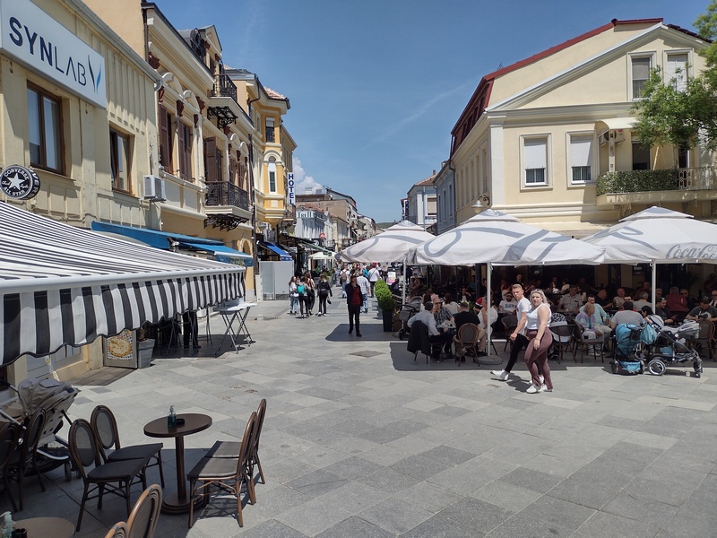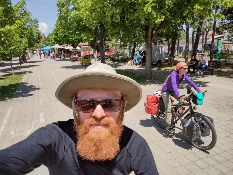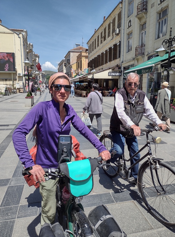 An der Südseite des Prespa-See radelten wir durch eine weitläufige Ebene, die zum Apfelanbau genutzt wird und sich deshalb auch sinngemäß „Appel-Land“ getauft hat. Die ansässigen Obstwirte haben aber anscheinend wenig Bedarf an anderen Speisen, da wir lange an keinem Laden vorbeikamen. Unsere Vorräte gingen zur Neige, doch wir fuhren auch noch den nächsten, im Vergleich zum Vortag jedoch geradezu lächerlichen Anstieg in den Pelister-Nationalpark hinauf und rollten auf den anderen Seiten in eine weitere wunderschöne Aussicht auf das Baba-Gebirge hinab. Die Straße die mal links mal rechts parallel der Hauptstraße verlief war offensichtlich vollständig aufgegeben worden und so mussten wir uns ordentlich in Acht nehmen nicht mit herabhängen Zweigen zu kollidieren. Es ging weiter und weiter bergab und so spülte uns der Weg schließlich wie von alleine in die Stadt Bitola. Dort kauften wir hungrig (und deshalb viel zu viel) ein, begaben uns dann noch ins Zentrum und staunten über den Trubel und die ausgelassene gute Stimmung, die dort herrschte: Die Fußgängerzone mit hübschen Altbauten war gesäumt von vollbesetzten Cafés. Der gepflegte Stadtpark war gefüllt mit entspannten Menschen. Ein gut gelaunter älterer Herr sprach uns an, weil er unsere Räder feierte und war vollends verzaubert als er von Julias Heidelberger Herkunft erfuhr. Angetan von der guten Stimmung gesellte sich ein weiterer älterer Herr zu unserer Runde, merkte aber schnell, dass er weder uns noch sich selbst persönlich weiterbrachte mit seiner Einmischung.