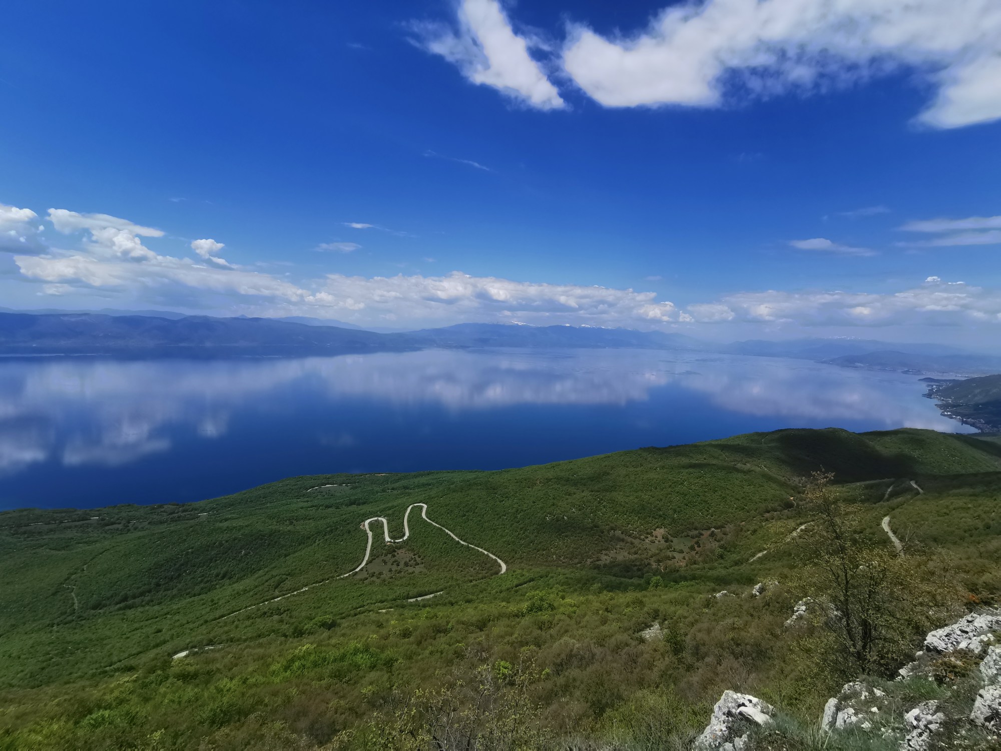Auf zwei Drittel der Strecke übermannte uns der Hunger und die Kräfte ließen nach. Doch kein geeigneter Rastplatz war in Sicht, wir schleppten uns noch etwas weiter und setzen uns dann doch in den Schatten an den Wegesrand und aßen schnell einen Zuckerblock (türkisches Nougat), da kein Hühnerbein aufzutreiben war. Danach war uns zwar schlecht, aber wir hatten genug Energie für den restlichen Aufstieg. Als wir um die nächste Ecke bogen, war es wie so oft, wenn man gerade auf ungemütlichen Steinen gevespert hatte: Ein wunderbarer komfortabler Rastplatz lag dort. Immerhin konnten wir an der dort gelegenen Quelle noch unsere Wasserflaschen auffüllen. Schließlich passierten wir sogar noch ein letztes Fleckchen Schnee, das in einer schattigen Ecke tapfer der Sonne trotzte. Auf dem Pass angekommen bewunderten wir den südlich des Passes gelegenen Gipfel des Marapo (2255 m) und staunten beim Blick zurück wie wir fast senkrecht den Berg hinaufgeklettert waren. Nachdem wir den Pass überwunden und noch einmal den Ohrid-See in seiner vollen Pracht bewundert hatten, ging es auf der anderen Seite bergab Richtung Prespa-See, auch hier eine grandiose Aussicht auf See und Berge. Natürlich gefiel uns diese Aussicht viel besser, denn wir konnten sie gemütlich im Rollen bestaunen und nicht während dem mühseligen Hochstrampeln. Allerdings konnten wir diese nur 20 Minuten bewundern, bei der Auffahrt auf der anderen Seite, hatten wir vier Stunden Zeit die Aussicht zu genießen.
