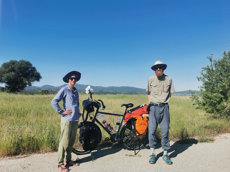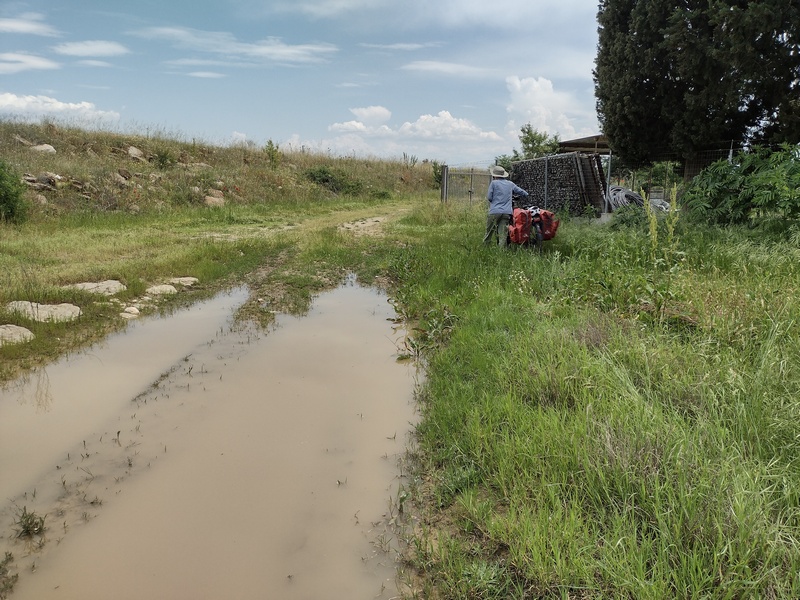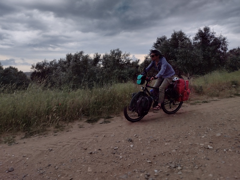 Für uns wurde es jedenfalls nun mit jedem Ort karger und rauer. Bereits jetzt im Mai war alles dort staubig und vertrocknet, kein Fleckchen Grün war noch zu entdecken. Wir begegneten zwei belgischen Radreisenden, mit denen wir ein Stück fuhren und unsere Erfahrungen austauschten, als uns bewusst wurde, dass mal wieder ein Gewitter im Anmarsch war. Wir traten ordentlich in die Pedale, der von uns eingeplante Campingplatz für diese Nacht war nicht mehr weit und wir waren optimistisch dies noch zu schaffen. Das hätte auch geklappt, wären wir den Schildern gefolgt und hätten uns nicht auf die Navigation verlassen, die schließlich auf einem Acker endete hinter dem sich eine Sumpflandschaft als unüberwindbare Hürde anschloss. Und dann stürzte über uns der Himmel zusammen. Der Acker verwandelte sich in wenigen Augenblicken in einen großen Morastkübel, aus dem wir die Fahrräder kaum noch rauszerren konnten, binnen Sekunden waren Bremsen, Schaltauge und der Raum zwischen Schutzblech und Reifen über und über mit zähem Matsch zugesetzt. Der dichte Regen, tosender Wind und Donnergrollen führte dazu, dass wir uns zu allem Überfluss auch noch aus den Augen verloren. Julia suchte den Weg zurück zur Hauptstraße, in der Annahme, Tilmann dort anzutreffen und Tilmann suchte Julia mit zunehmender Verzweiflung, in der Annahme, der Sumpf hätte sie verschlungen. Über uns schoss Zeus seine Blitze und Donner auf uns nieder und bestrafte uns im Auftrag von Aergia dafür, dass wir uns nicht länger ausgeruht hatten. Glücklicherweise versank keiner im Moor und niemand wurde von einem umknickenden Strommast erschlagen. Die freudige Wiedervereinigung gelang zwei Stunde später auf dem Campingplatz, der während der verzweifelten Momente im Unwetter auf offenem Feld die ganze Zeit nur einen Steinwurf entfernt gewesen war.