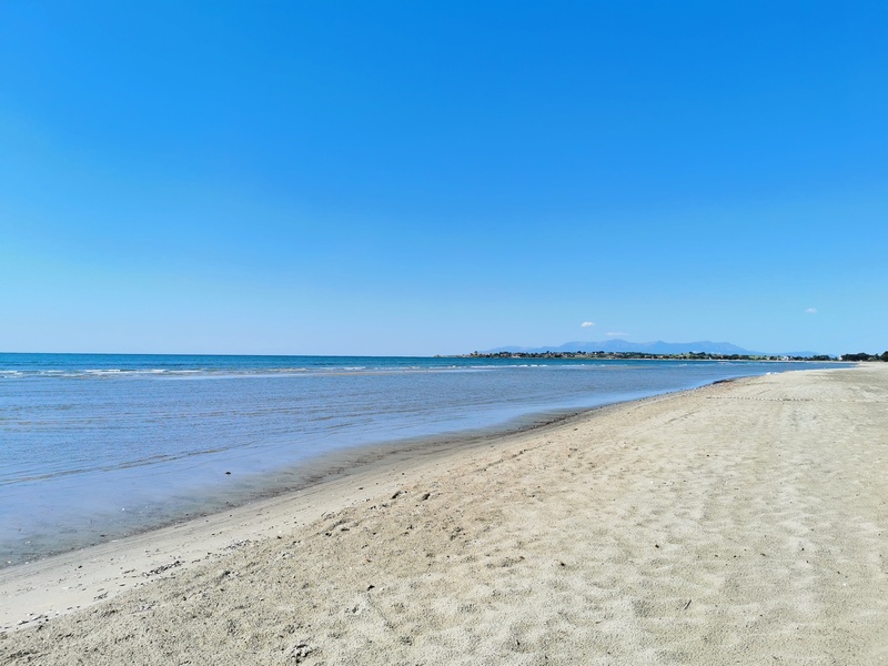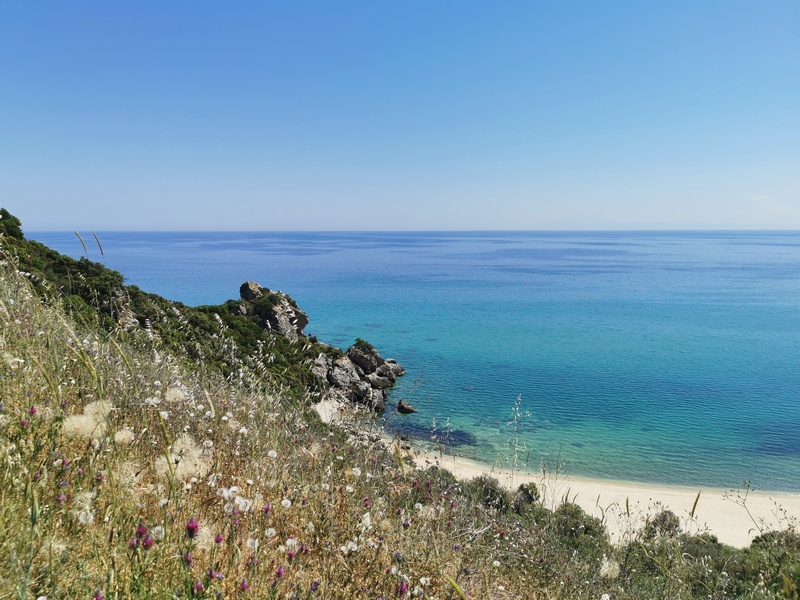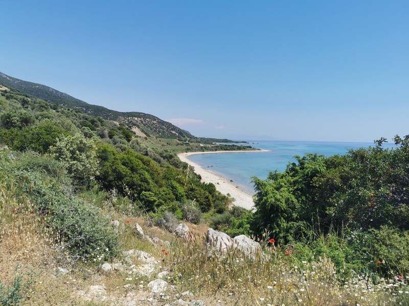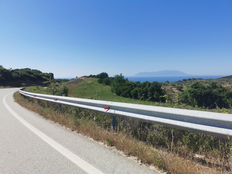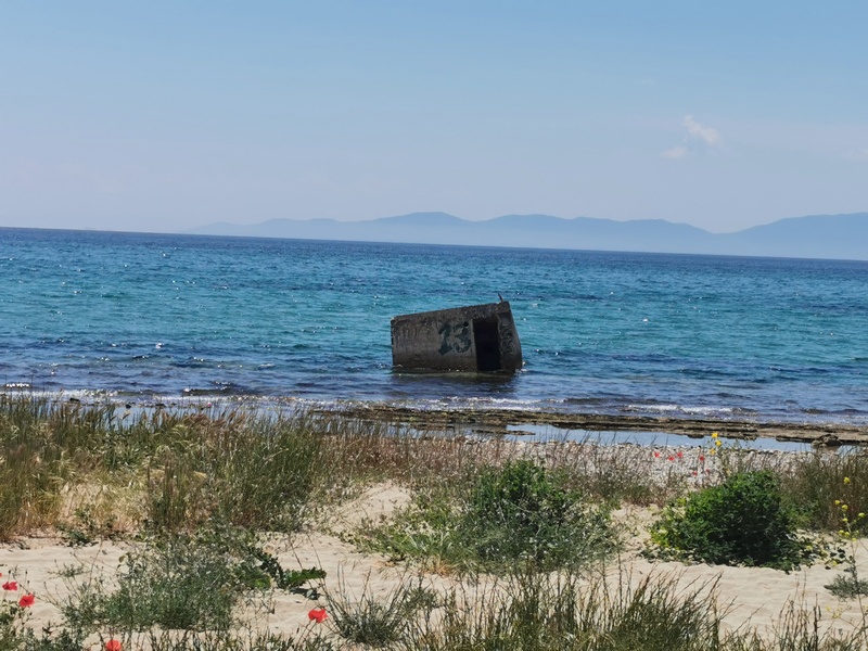 Wir stehen meistens schon vor 7 Uhr auf, brauchen aber etwa 1,5 bis 2 Stunden, um alles wieder einzupacken und zu frühstücken. Kathrin braucht etwa genauso lange, schläft aber wesentlich länger. Deshalb setzten wir uns am nächsten Tag getrennt in Bewegung. Nach kurzer Fahrt, stießen wir bei Nea Vrasna an die Küste, die in dieser Gegend geprägt ist durch flache lange Strände, mit wenigen schattenspendenden Bäumen, dafür vielen schattenspendenden Cafés und Restaurants und ein paar Bunkern, die mittlerweile schief am Strand oder schon halb im Meer herumliegen und Julia an die französische Atlantikküste erinnerten. Das Wasser war bereits hier herrlich türkisblau und bald wurde auch die Küstenlandschaft immer schöner: Felsiger und bewaldet, noch dazu kaum besiedelt. Eigentlich mal wieder viel zu schön, um weiterzufahren. Doch hier zeigt sich die Problematik, die wir häufig haben: Schön ist es meistens dort, wo niemand ist, aber dann ist weit und breit kein Wasser und kein Essen zu kriegen. Immer wieder stellen wir uns die Frage: Sollen wir mehr Vorräte mitnehmen, damit aber gleichzeitig immer das ganze Gewicht rumschleppen? Es ist wie mit dem bekannten Bus-Phänomen. Kauft man üppig ein, kommen hinterher 10 weiter Läden. Kauft man nur einen schnelles Snack, kommt kein Laden mehr und man muss länger weiterfahren, als man möchte.