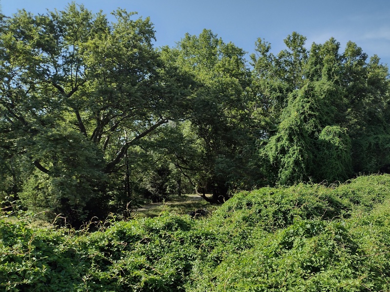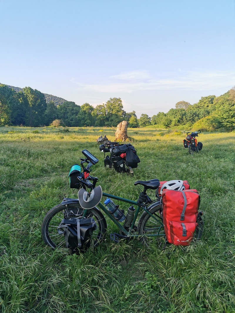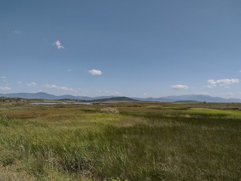 Etwas verkatert stiegen wir am nächsten Tag wieder aufs Rad, es zog uns raus aus der Stadt in die Natur. Zunächst mussten wir allerdings mal wieder eine ganze Weile durch etwas langweilige und staubige Agrarlandschaft fahren, nachdem wir die nördlich und östlich von Thessaloniki gelegenen Hügel überwunden hatten. Nun waren wir der Sonne ungeschützt ausgesetzt und fuhren zudem parallel zur Autobahn in manche Sackgasse, da die Aktualisierung des Kartenmaterials offenbar dem Verfall des Nebenstraßennetzes nicht Schritt halten kann. Nachmittags kamen wir am Volvi-See an, wo wir eine Kaffee-Pause einlegten (abermals erstaunt, dass die Preise deutlich höher sind, als in Deutschland) und wurden während unserer Rast von Kathrin eingeholt. Gemeinsam fuhren wir weiter und freuten uns alle drei, als die karge trockene Landschaft ganz plötzlich in ein Tal mit klarem Flüsschen und einem verwunschenen Wald überging. Obwohl unser Plan war, noch bis an die Küste zu fahren, war uns allen klar: Wo es so schön ist, muss man bleiben. Schnell fanden wir einen geeigneten Platz für ein Nachtlager und sprangen in den Fluss, der überraschenderweise eine sehr angenehme Temperatur für ein Bad hatte.