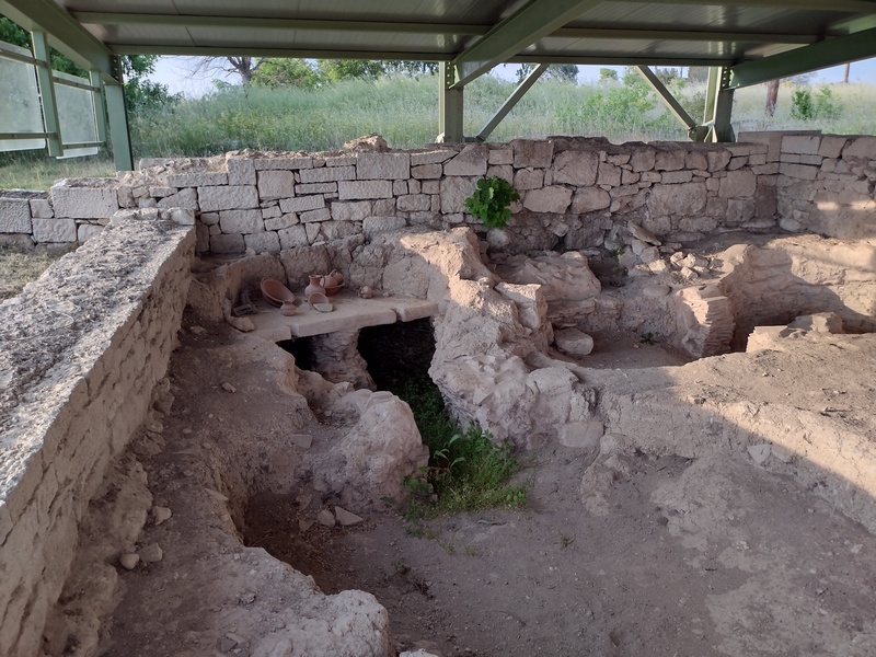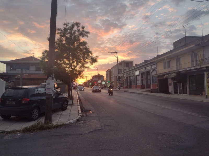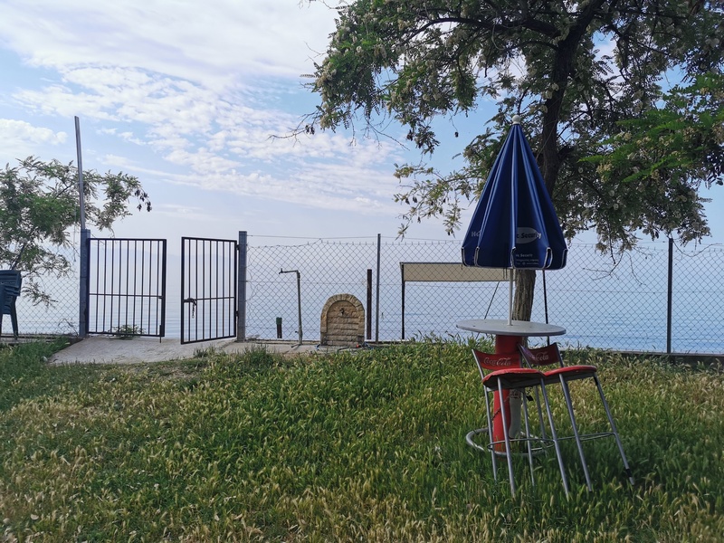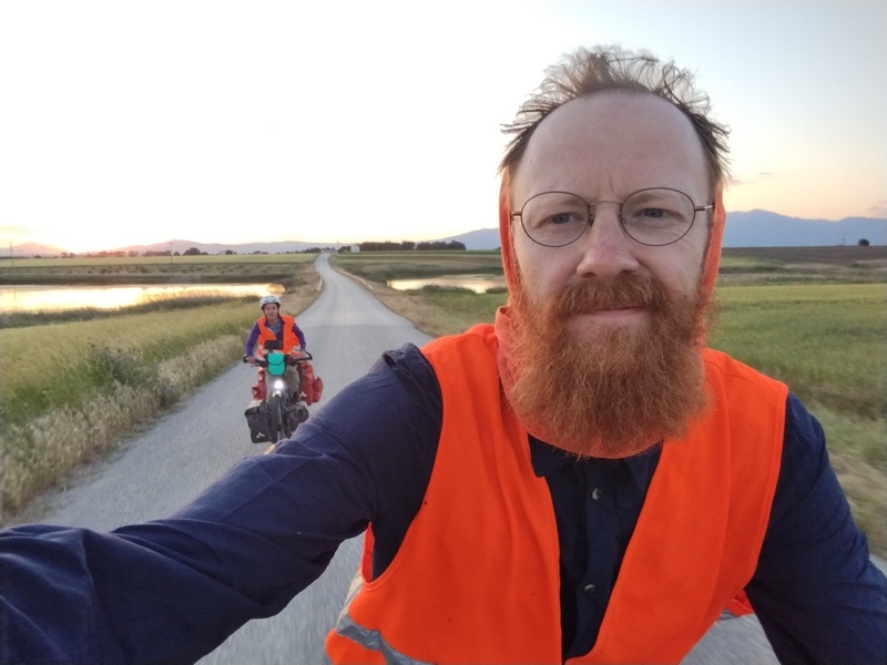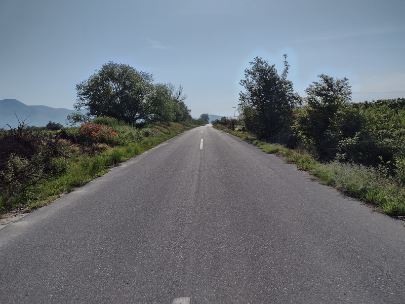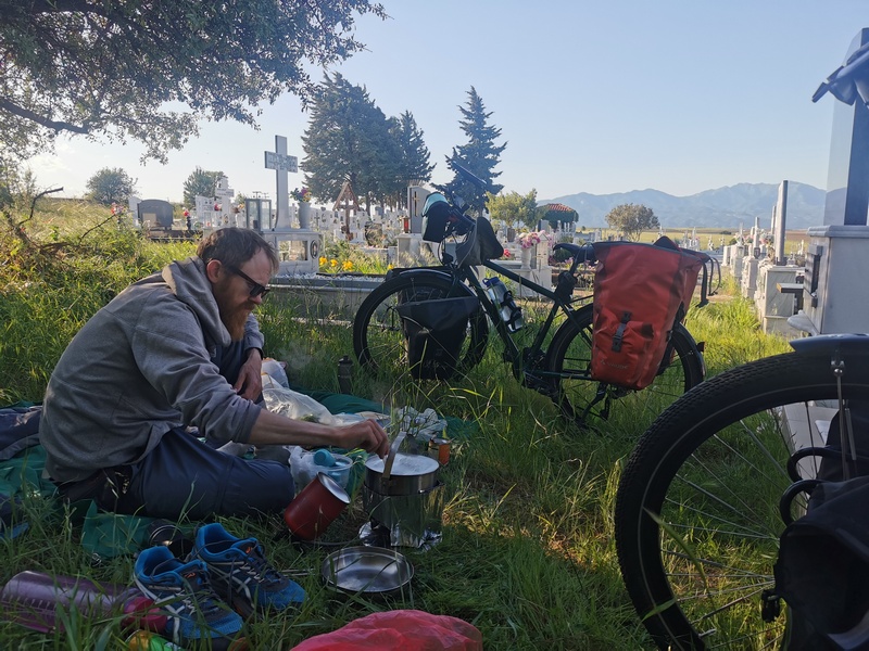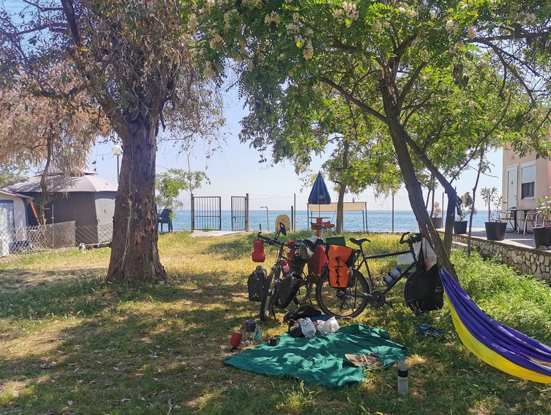 Sehr entspannt fuhren wir weiter, ließen uns aber von dem Gegenwind bald wieder von der Straße abbringen und ein Café aufsuchen. Dort herrschte reger Betrieb, auffällig waren zahlreiche Frauen in Militäruniform. Eine half uns dann bei unserer Bestellung (etwas ohne Fleisch – puh schwierig…“auch keine Muscheln?“) und erzählte, dass ein Militärstützpunkt ausschließlich für Frauen in der Nähe sei. Da alle dort Bier tranken, genehmigten wir uns auch eines, was unsere Lust weiter gegen den Wind anzukämpfen noch zusätzlich schmälerte. So schrieben wir zunächst unseren Nordmazedonien-Bericht zu ende und konnten diesen endlich veröffentlichen. Im Anschluss fuhren wir noch einmal ca. 10 Kilometer und suchten uns auf einem Friedhof ein ruhiges Plätzchen, wo wir den Abend abzuwarten gedachten. In der üblicherweise windstilleren Nacht wollten wir, wie dereinst auf dem Donauradweg, weiterziehen. Unsere Hoffnung bezüglich des Windes trat ein, allerdings merkten wir ebenfalls, dass eine Bike-Ride-Night in Griechenland nicht das gleiche ist, wie in Österreich. Schlechte Wege, in der Dämmerung unüberquerbare Furten und uns abermals verfolgende Hundehorden nagten vor allem an Julias Nerven, sodass wir nach weiteren knapp 25 Kilometern im erst besten Dorf eine Frau (die, wie sich rausstellte keine Griechin sondern eine Türkin war) ansprachen, ob wir eventuell in ihrem Garten zelten könnten. Obwohl wir uns kaum verständigen konnten, verstand sie sogleich, nahm uns im Handumdrehen ins Schlepptau und führte uns in einen wunderschönen gepflegten Garten mit Golfrasen, perfekt geeignet für ein Zelt, dass wir sogleich geneigt waren aufzuschlagen. Doch sie schüttelte den Kopf, führte uns in eine Art Wohnzimmer mit Küchenzeile und zeigte auf die beiden Sofas. Sehr überrascht und dankbar nahmen wir das Angebot an und obwohl wir ein Essen abgelehnt hatten (wir waren wirklich nicht hungrig) bekamen wir von ihrem Mann noch 2 Sandwich, 2 Eier und 2 Trinkpäckchen gebracht. Beide verschwanden dann aber umgehend in ihren eigenen separat liegenden Zimmern und wir waren auch ganz froh, dass wir nun nicht mehr mit Händen und Füßen reden mussten, sondern uns schnell hinlegen konnten. Das ganze „Geschäft“ zwischen erstem Ansprechen und in Frieden uns selbst überlassen werden (mit Essen versorgt und Dach über dem Kopf) war in weniger als 5 Minuten abgewickelt gewesen.