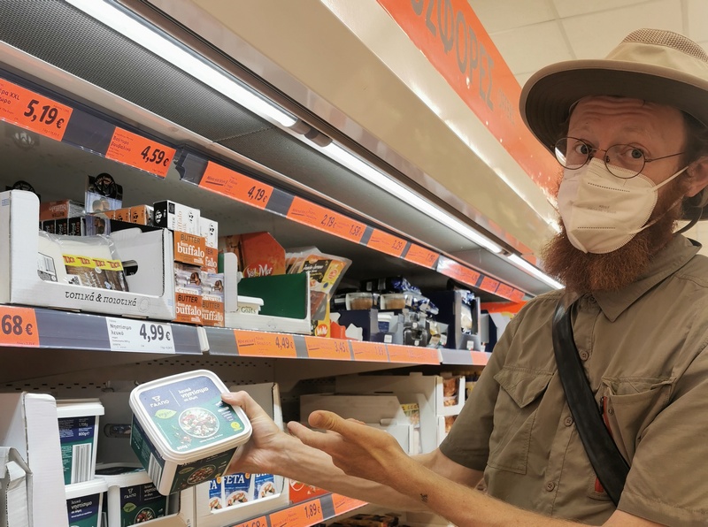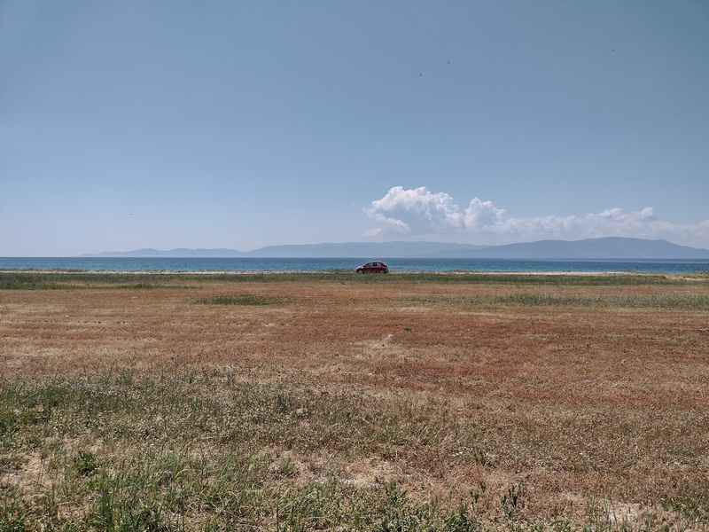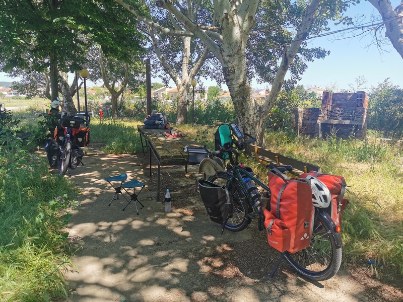 Jetzt wollten wir es aber endlich aus Griechenland raus schaffen, sagten wir uns am nächsten Morgen und Tilmann wünschte sich außerdem am nächsten Tag, seinem Geburtstag, in der Türkei zu Frühstücken. Unser Weg führt uns zunächst parallel zu Autobahn nach Alexandroupolis und wir stießen erneut an die Via Egnatia. Zur Küste hin wurde die Gegend hügelig und schroff und der Blick aufs Meer war einmal wieder atemberaubend. In Alexandroupolis – einer mäßig attraktiven Hafenstadt mit vielen Restaurants für Besuchermassen – gingen wir mit voller Überzeugung bei Lidl einkaufen. Dorthin hatte uns vor allem ein Produkt gelockt, dass wir vorher schon einmal entdeckt, aufgrund seiner mangelnden Kompatibilität mit unserem Reisestil jedoch bisher verschmäht hatten. Nun begehrten wir es aber dringend: 800 Gramm veganer Feta-Väse! Diesen verkochten wir am Abend zu einer Väse-Lauch-Suppe, die einfach köstlich war. Vor diesem Vergnügen jedoch wieder: Öde Agrarflächen und Gegenwind. Auf einer verwilderten Festwiese mit Schatten spendenden Platanen legten wir eine längere Pause ein und freuten uns, als danach die Gegend wieder grüner wurde.