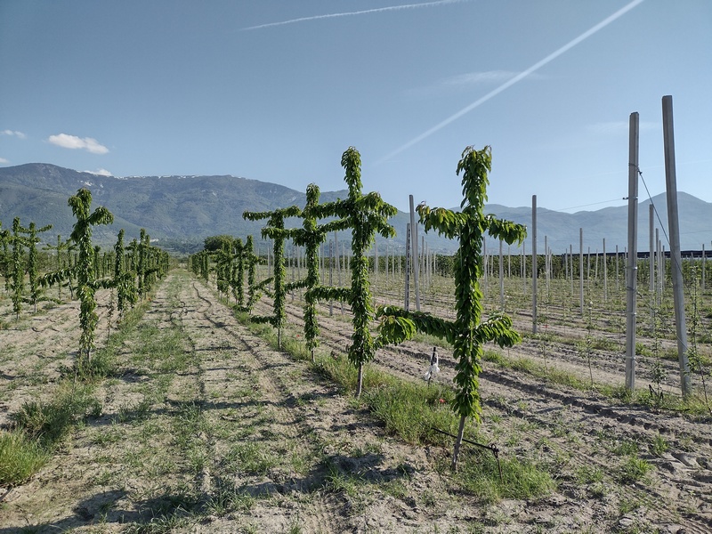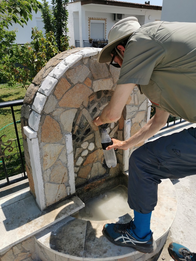 Mit der Abfahrt aus Edessa befanden wir uns nun in einer weitläufigen Ebene, die ebenfalls für den Obstanbau genutzt wird – diesmal Nektarinen und Kiwis. Zwischen den Plantagen gab es alle 10 km einen kleinen schachbretthaft angelegten Ort, deren Mittelpunkt eine orthodoxe Kirche bildete, wo immer ein Picknicktisch sowie ein Brunnen mit Trinkwasser zu finden war – sozusagen das Paradies für Fahrradreisende. Im Schatten der Obstbäume war auch das Radeln an diesem heißen Tag angenehm. Doch dann wechselte die Bewirtschaftung zu Getreide und umgepflügten Äckern, der Hunger wurde größer, doch genau da war mal wieder weit und breit kein Rastplatz in Sicht. Zu allem Überfluss nahm der Gegenwind zu und der Weg wurde steinig und sandig. Unsere Lebensfreude verabschiedete sich zwar nicht gleich in den Urlaub, eine kleine Verschnaufpause meinte sie jedoch sich schon genehmigen zu müssen. Als wir nach der Durchquerung eines trockengefallenen Flussbettes endlich das nächste Dorf erreichten, hätten wir uns auch mit dem Schatten einer Bushaltestelle begnügt und waren dann überaus entzückt, als wir eine kleine schöne Kirche mit gepflegtem Garten und Picknickbank entdeckten. Als wir uns gerade setzten, kam der Pfarrer um die Ecke und grüßte, wenn auch nicht gleich besonders überschwänglich, sodass Tilmann in einem ersten irrationalen Impuls schon befürchtete der Rastplatz wäre Pilgern vorbehalten und wir unerwünscht. Selbstverständlich war das Gegenteil der Fall und wir wurden im Ort willkommen geheißen. Während wir mit unserem Vesper begannen füllte sich der Kirchhof mit Kindern, deren Eltern und weiteren Gemeindemitgliedern. Kurz darauf bekam wir einen Kaffee angeboten, den wir natürlich nicht ausschlugen. Hinzu kam ein großer Teller mit sehr süßen Keksen, schließlich wurden noch Bier und Vanillekipferl gereicht. Bald gesellten sich einige Dorfbewohner zu uns, von denen viele etwas bis sehr viel Deutsch sprachen. Alle waren ausgelassen, sehr interessiert an unserer Reise und schlossen uns offenbar gleich in ihr Herz, da Julia von einer älteren Dame minutenlang in den Arm genommen wurde als ein gemeinsames Foto geschossen werden sollte. Schließlich bekamen wir die Kirche gezeigt und die Historie des Dorfes erläutert. Wie wir bereits vermutet hatten, war dieses, wie auch die anderen Dörfer der Umgebung erst in der 50er Jahren mit dem Großwerden des Obstanbaus entstanden, dafür hatte aber zunächst ein damals noch vorhandener See trockengelegt werden müssen. Die Gastfreundschaft des Dorfes Paralimni hatten uns aufs unserem Nachmittagstief gerettet und wir fuhren beschwingt in den Abend hinein. Mal im Ernst, wir waren noch immer in der EU unterwegs, also quasi fast noch in Deutschland. Diese Willkommenskultur hatte schon fast klischeehafte Züge (was natürlich nicht im Mindesten einen Funkten von Kritik abbilden soll!), mit so etwas hatten wir frühestens am Hindukush gerechnet, der allerdings eigentlich auch gar nicht auf unserer Route liegt.