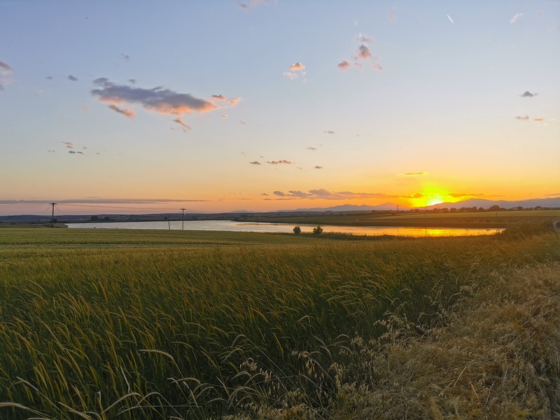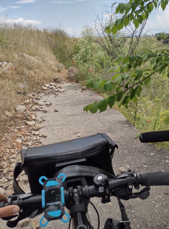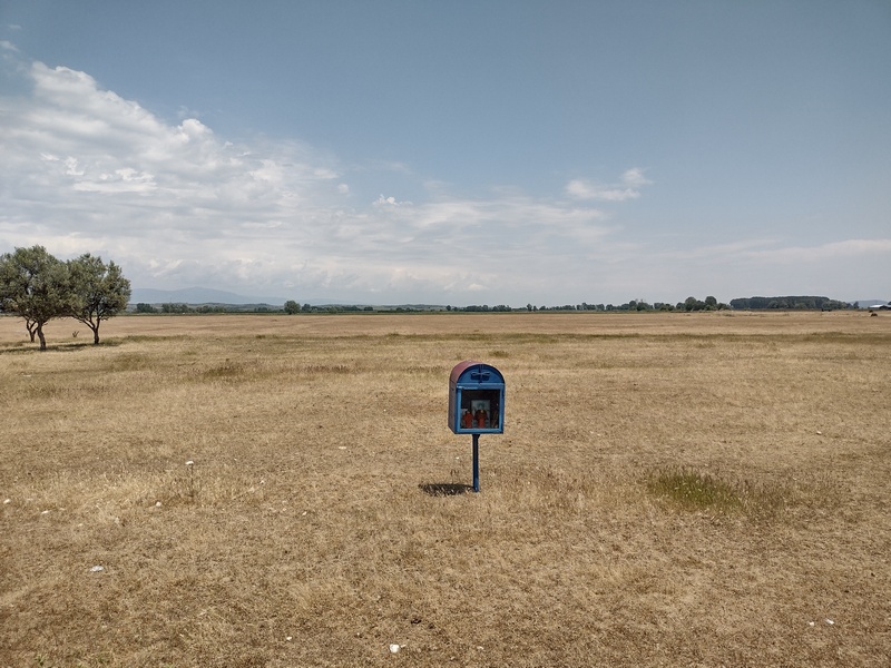 Denn tagsdrauf wurde zunächst die Ödnis unerträglich: Endlose gerade Landstraßen an trockenen Feldern entlang, die nicht einmal von Dörfern durchbrochen wurden. Für eine Pausen bogen wir extra in ein Dorf ab und fanden unter ein paar Bäumen auf dem Dorfplatz eine schattige Bank. Während wir unsere fettigen gefüllten Pfannkuchen verzehrten, kam ein älterer Herr in Gummistiefeln (trotz Trockenheit und 28 Grad) herbei, inspizierte unsere Fahrräder und wollte sich mit uns unterhalten. Wenn wirklich keine gemeinsame Sprache gefunden werden kann, erzählen wir mittlerweile einfach auf Deutsch was wir machen und versuchen dies mit Gesten zu unterlegen. Ein tiefgründiger Austausch kommt dabei nicht zustande, aber es ist immer wieder nett und lustig, dass die Leute ganz ohne Scheu auf uns zukommen und gerne mehr erfahren würden. Unbeantwortet blieb leider auch unsere Frage, ob sein Schuhwerk nicht etwas warm sei, angesichts der Temperaturen. Schon bei diesem Dorf hatten wir uns gefragt, warum man gerne in dieser weiten öden Landschaft lebt, wobei sich ein Thrakier bei einer Stippvisite des Bergischen Landes an einem verregneten Novembertag ggf. auch Gedanken um den finsteren Film macht, auf dem sich seine Bewohner befinden.