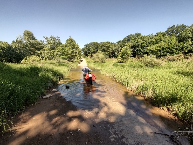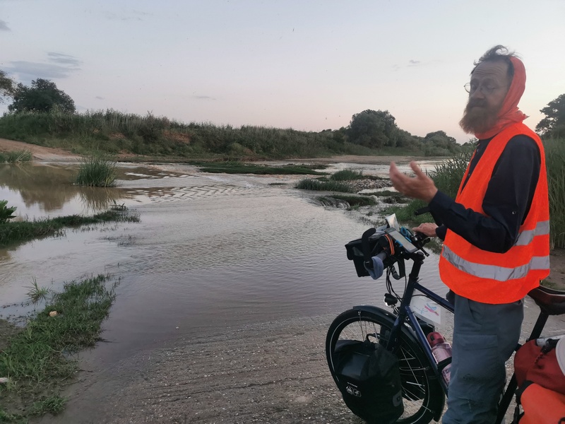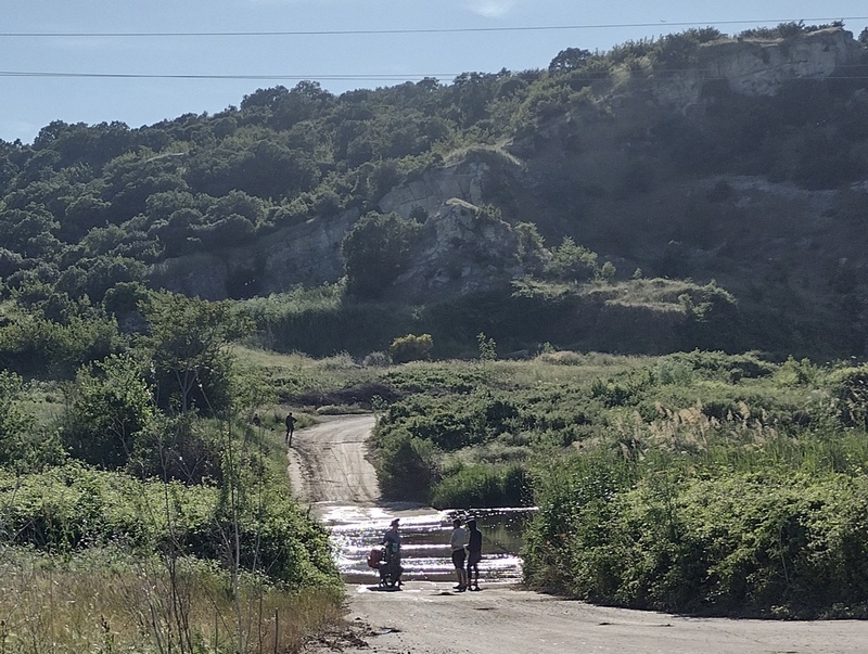Bald steuerten wir auf die Grenze zu und waren zuversichtlich es heute noch in das neue Land zu schaffen. An einem Flusslauf begegneten wir bei der Querung einer Furt (diese war so flach und zudem betoniert sodass wir sie erstmalig tatsächlich befahren konnten), wie zuletzt im österreichisch-ungarischen Grenzgebiet einer Gruppe Geflüchteter, wieder junge Männer, die etwas ziellos herumstanden. Sie sprachen uns an und wollten Unterstützung bei der Weiterreise. Da wir diese erneut nicht leisten konnten, gaben wir ihnen zumindest eine Packung Nüsse, einen Vorsatz, den wir uns bei unserer letzten Begegnung mit Geflüchteten in Österreich gemacht hatten. Sie bedankten sich freundlich.