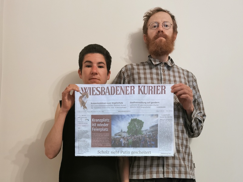 Offenbar kursieren selbst unter Lesern dieses Insider-Blogs Gerüchte, dass wir nicht wirklich auf einem Dachboden der Wiesbadener Goebenstraße sitzen, sondern tatsächlich der absurden Idee einer Weltreise per Fahrrad nachgehen. Das ist natürlich Unsinn, hängt aber wohl damit zusammen, dass wir bei unseren letzten fiktiven Berichten keine entsprechenden Gegenbeweise mehr angebracht haben. Das wollen wir nun mit dem folgenden Foto nachholen. Es zeigt uns auf dem Dachboden mit der gestrigen Ausgabe des Wiesbadener Kuriers. Es gibt wohl niemanden der ernsthaft annehmen möchte, dass man dieses Druckerzeugnis in Istanbul (auch wenn es sich um eine Weltstadt handelt) auftreiben könne.