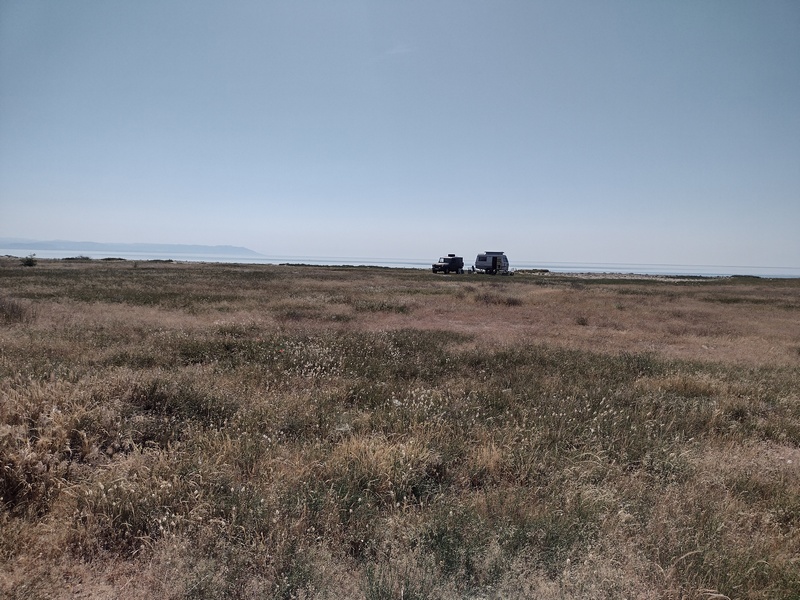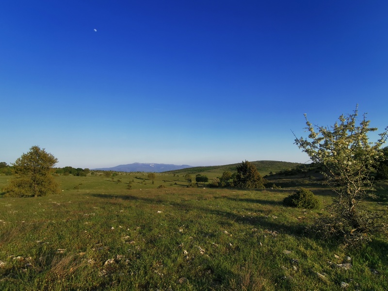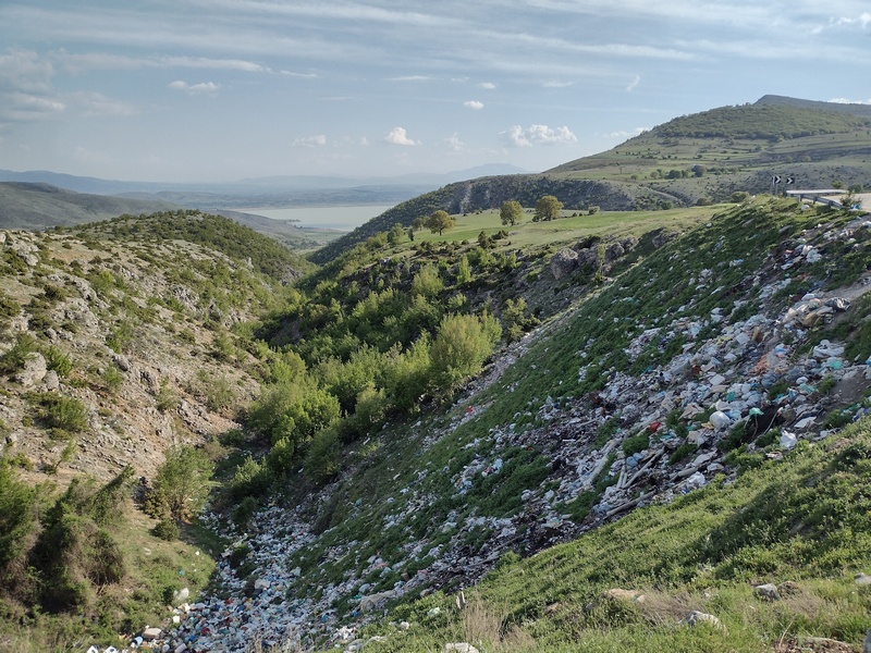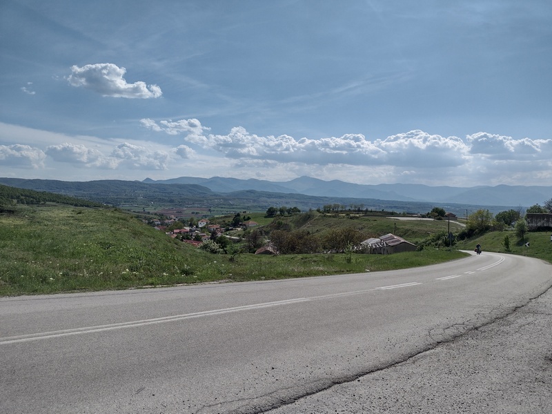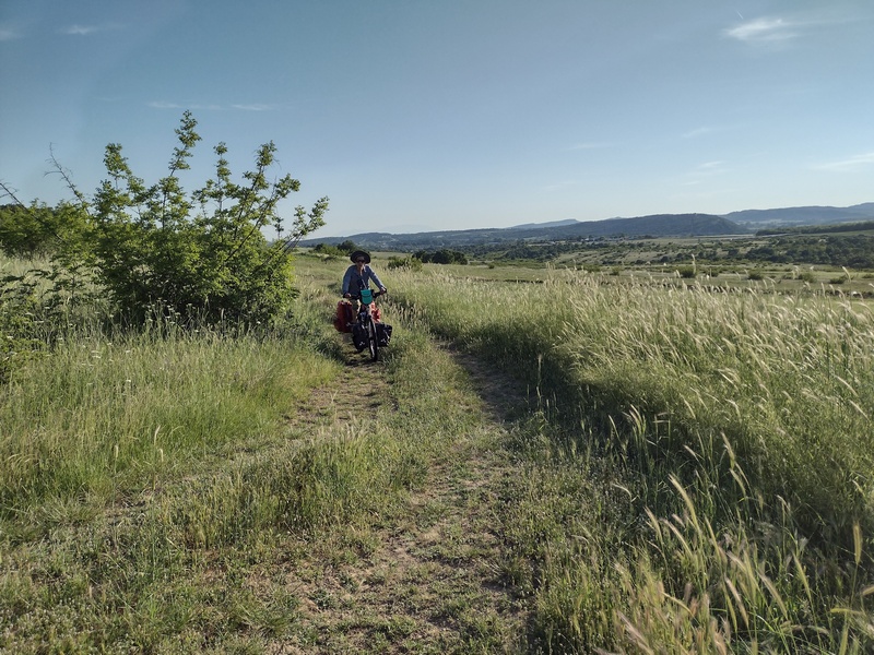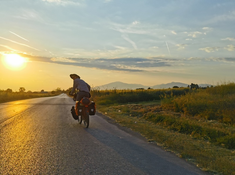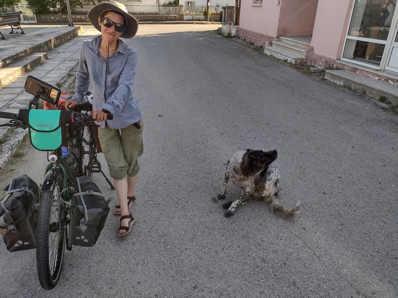 Nachdem wir die Grenze von Nord- nach Westmazedonien hinter uns gelassen hatten, dauerte es geschlagene 70 km bis wir wieder auf einen Supermarkt stießen und einen Einkauf tätigen konnten. Auch Cafés und Restaurants gab es keine an unserer Strecke. Wir waren überrascht wie „leer“ das Land war. Insofern waren wir nun doch froh, dass wir in Bitola hungrig eingekauft hatten, denn so waren wir für diese unerwartete Durststrecke gut versorgt. Zunächst durchquerten wir in der Ebene von Lynkestis endlose Agrarflächen, bevor wir uns nach Osten wendeten und auf das Voras-Massiv zusteuerten, dessen südliche Ausläufer wir am Nordufer des Vegoritida-Sees überwanden. Nach ein paar unerfreulichen Begegnungen mit Schäferhunden entschied sich Tilmann während einer erneuten langwierigen Verfolgung durch zwei besonders hartnäckige Kläffer, dass ein wohl dosierter Pfefferspray-Spritzer auf die Hundenasen vertretbar wäre. Die beiden schnaubten nur kurz und schütteten den Kopf, hatten sie doch die kleinst mögliche Dosis abbekommen, waren aber dennoch beeindruckt genug, um umgehend inne zu halten. Die Hundehorden, die uns nun regelmäßige am Reifen hingen (einer versuchte auch in diesen hineinzubeißen), beschützten die Schafe, die die Landschaft geprägten, durch die wir nun fuhren: Magere Wiesen, angeknabberte Büsche, junge Bäume, die um zu überleben Stacheln hatten, ab und an standen die einfachen Häuser der Hirten am Wegesrand. Obwohl die Hunde nicht gerade gastfreundlich waren, verlockte uns die weitläufige Landschaft und die 100 Kilometer, die wir bereits in den Beinen hatten, hier unser Zelt aufzuschlagen. Um sicher zu gehen, versuchten wir eine Bäuerin zu fragen, ob dies ok wäre. Trotz Zeichensprache und unserem mitgebrachten Zeige-Wörterbuch, mit dem wir mehrmals auf das Bild eines Zeltes zeigten, waren wir uns nicht ganz sicher, ob sie unser Anliegen wirklich verstand, da sie immer nur mit den Schultern zuckte. Doch dann realisierten wir, dass sie uns damit nur mitteilen wollten: „Das ist mir doch egal“. Sie zeigte dann wiederum auf ihren Hof, der jedoch von Hühnern, Hunden und Pferden bevölkert war und etwas ungepflegt auf uns wirkt. Deshalb lächelten wir freundlich und zogen hinter den nächsten Hügel weiter. Auch die Befürchtung in der Nacht doch noch von den Hundehorden oder unwahrscheinlicher von Wölfen oder Bären heimgesucht zu werden, bewahrheitete sich nicht und so verbrachten wir eine sehr ruhige Nacht in dieser rauen Gegen in 900 m Höhe.