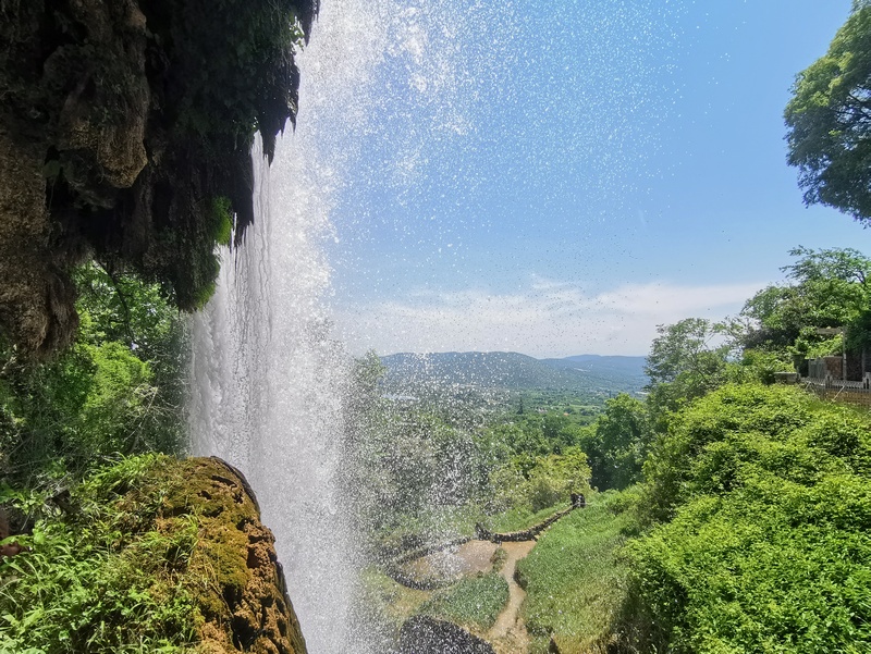 Nach der Fahrt durch Obstplantagen – diesmal hauptsächlich Kirschen, leider hatten wir die Blütezeit aber anscheinend gerade eben verpasst – und einem größeren geschützten Sumpfgebiet, kamen wir endlich bei besagtem Café an, bekam von der (deutschsprechenden) Inhaberin unsere dringend benötigte Koffeindosis und konnten uns damit an die Planung machen, wie es eigentlich weitergehen soll. Wir entdeckten über den Whatsapp-Status von Kathrin, die uns nun einige Stunden voraus war, dass es in der nächsten Stadt, Edessa, einen Wasserfall geben soll. Beinah wären wir daran vorbei gefahren. Dort angekommen, waren wir zwar entsetzt von den Horden an Schulkindern, die wie überall auf der Welt vertrottelt in Durchgängen herumstanden und in regelmäßigen eruptiven Prozessen kollektiv eine Mischung aus hysterisch Schreien und überdrehten Lachern hervorbrachten. Dennoch waren wir natürlich nachsichtig, ob deren Wunsch diesen besonderen Ort zu besuchen. Die Stadt Edessa liegt an einer Geländekante, an der die Hochebene des Vegoritida-Sees einfach abbricht und der Fluss Edessos vom größten Wasserfall namens Karanos aus 70 Meter in die Tiefe stürzt. Hinter dem Wasserfall, als wäre es der Besonderheiten nicht genug, befindet sich auch noch eine kleine Tropfsteinhöhle, die weiterhin wächst und damit eine besonders seltenes Phänomen ist. Die alten Griechen hatten diesen Ort natürlich auch bereits als etwas extraordinäres angesehen und einen Tempel mit Blick auf den Wasserfall errichtet, dessen Überreste wir auch noch besuchen konnten.
