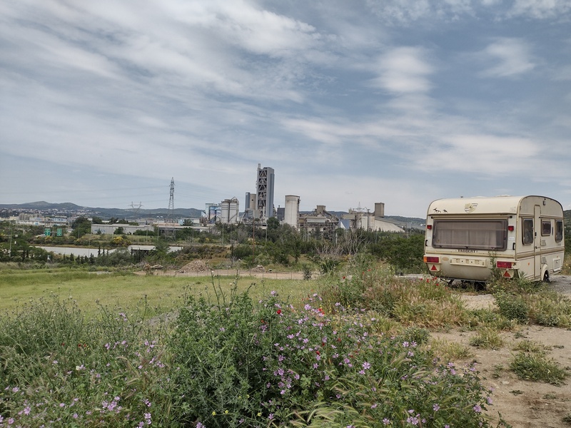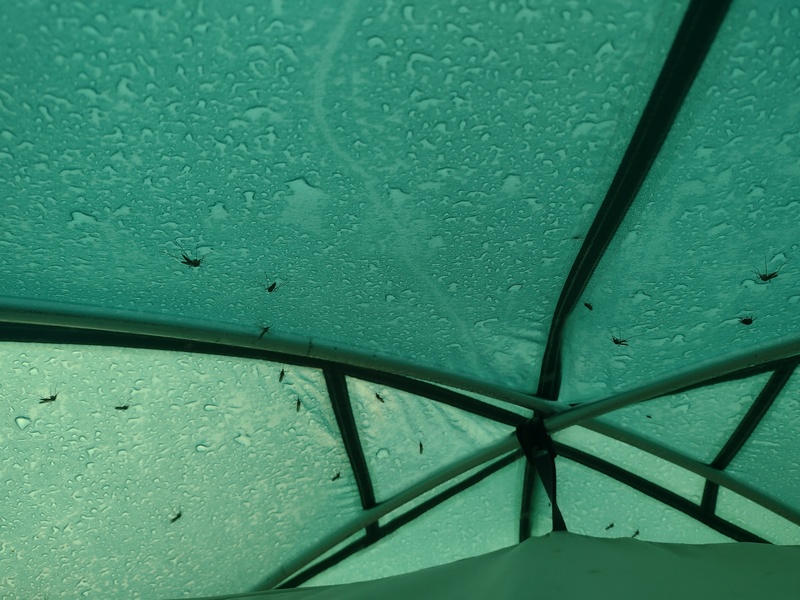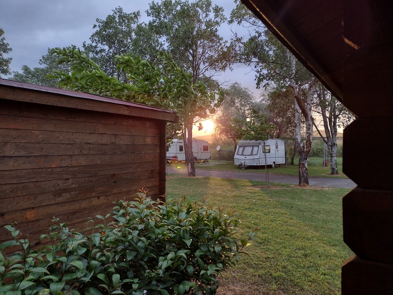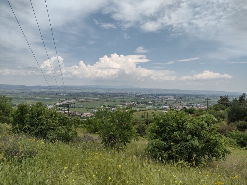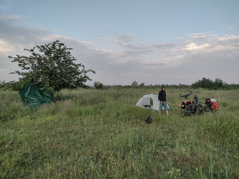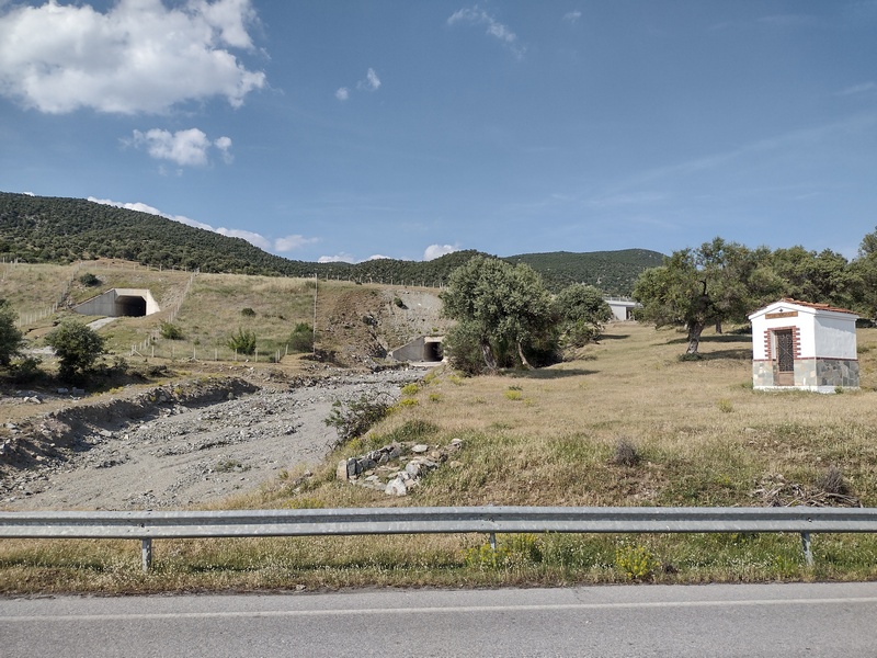 Wir hatten das Angebot ausgeschlagen auf dem Kirchhof zu zelten, da wir noch näher an Thessaloniki herankommen wollten. Quittiert wurde diese Entscheidung mit dem bisher wohl schlechtesten Schlafplatz im Zelt nur unweit der Hauptstraße E02 auf einer Wiese, wo wir zunächst ein Fleckchen ohne Müll und Disteln finden mussten und wir uns aufgrund der hohen Konzentration von ca. 40 Mücken pro m³ Luft dazu entscheiden das kalte Abendessen im Zelt einzunehmen.