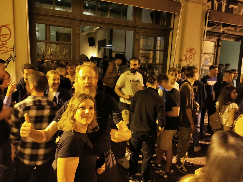 Die Einfahrt in die zweitgrößte Stadt Griechenlands (ca. 326.000 EW) beeindruckte insoweit, als dass wir zwar bis kurz vor dem Stadtkern ausschließlich durch schmucklose Gewerbegebiete fuhren, diese jedoch anders als andere Städte in Europa ausschließlich in griechischer Hand waren. Kein Max Bahr, kein Praktiker, kein Kaufland, kein Lidl, kein Carrefour. Die Straßen machten einen ziemlich rauen Eindruck und wir sahen erstmals auf unserer Reise auch deutliche Zeichen echter Armut, beispielsweise Menschen, die in riesigen Handkarren Müll sammelten, um diesen irgendwo gegen ein paar Cent eintauschen zu können. Auch dies wiederum hätten wir eher schon zu einem früheren Zeitpunkt unserer Reise erwartet, die Länder des ehemaligen Jugoslawiens und Albanien hingegen erschienen uns überraschend wohlhabend. Beim ersten Stadtbummel am Nachmittag gab die Innenstadt ein äußerst zwiespältiges Bild ab: Die meisten Ladenzeilen waren dauerhaft geschlossen, verrammelt und vergammelt. Doch die zahlreichen Restaurants und Kneipen waren sehr individuell und schick gestaltet sowie gut gefüllt mit üppig speisenden Griechen, die das Leben in vollen Zügen genossen. Daran wollten wir auch teilhaben und stürzten uns gegen Abend gemeinsam mit Kathrin aus Limburg, die wir mittlerweile wieder eingeholt und uns mit ihr zum Bier trinken verabredet hatten, ins Nachtleben. Wir waren begeistert: Volle Bars, laute Musik, viele Menschen in Feierlaune. Da floss das Bier schnell, doch die Rechnung ließ uns fast vom Barhocker fallen: Für 13 Bier durften wir 65 Euro zahlen. In der Annahme eine besonders teure Bar erwischt zu haben, versuchten wir unser Glück noch einmal um die Ecke: Doch 5 Euro für ein 0,33-Bier schien hier der normale Preis zu sein. Wir ließen uns die Stimmung trotzdem nicht verderben, vor allem, weil wir ohne uns vorab informiert zu haben in einen scheinbar sehr angesagten Club (ohne Eintritt) stolperten und endlich einmal wieder die Gelegenheit zum Tanzen zu elektronischer Musik bekamen.