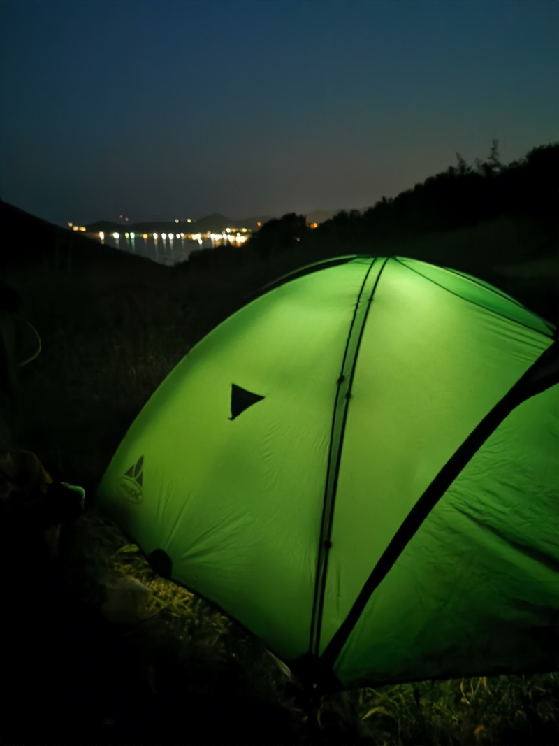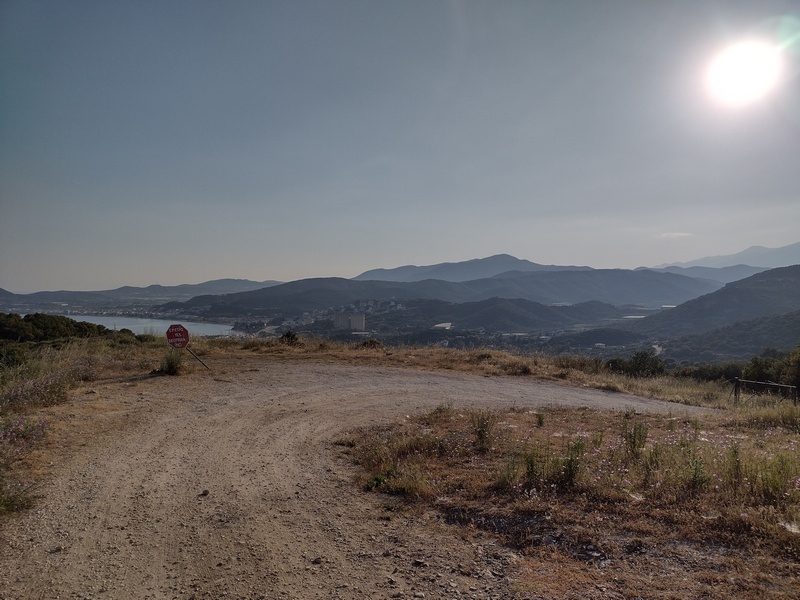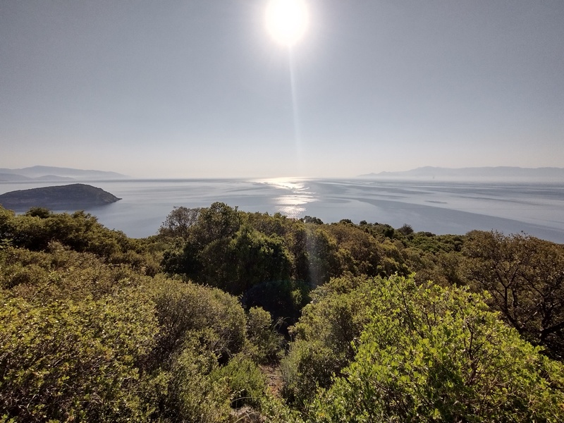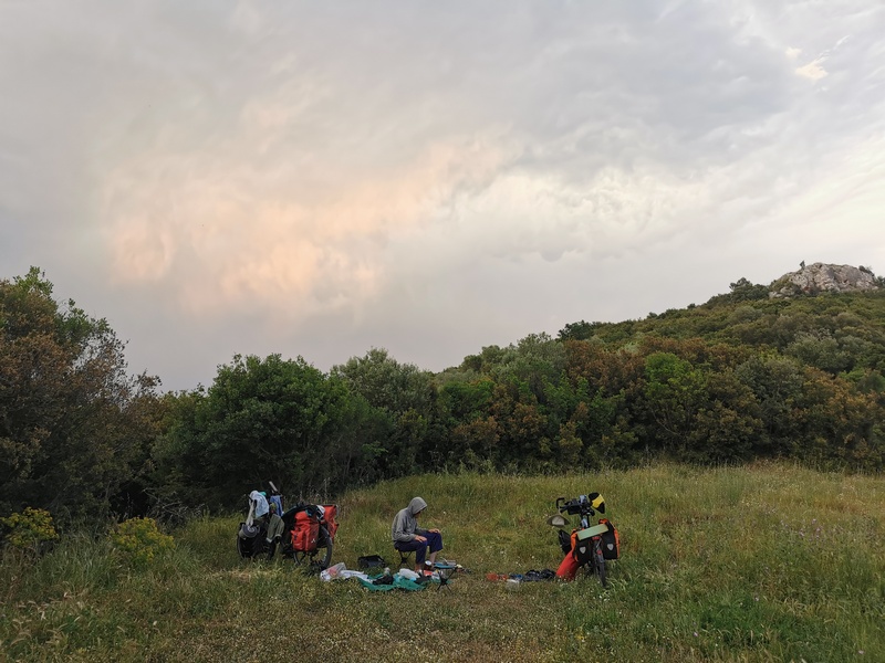 Immerhin machten wir so an diesem Tag noch einiges an Strecke und beschlossen an einer nicht besiedelten Landzunge zu kampieren. Blöderweise war das Höhenprofil nicht zu erahnen gewesen und so mussten wir am Ende dieses heißen Tages auch noch einen unanständig steilen und noch dazu steinigen Weg hochfahren, entdeckten aber immerhin auf der Kuppe einen perfekten Zeltplatz. Während ein Gewitter in unsere Richtung rollte, kochten wir schnell Nudeln und bauten das Zelt auf. An diesem Tag verschonte uns Zeus noch einmal – gab uns aber nur eine Gnadenfrist.