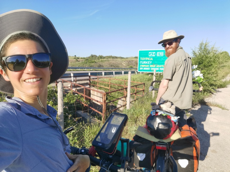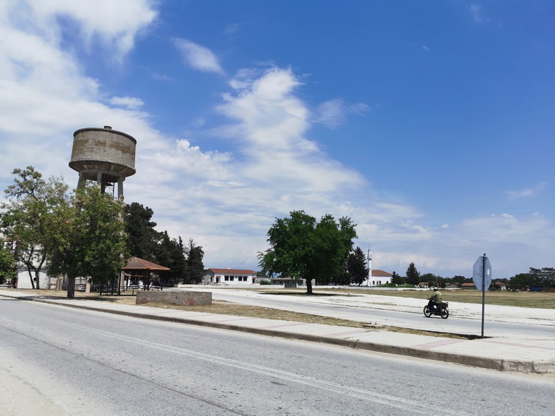 Es waren nur noch wenige Kilometer bis zu Grenze und von einer Anhöhe aus war die Türkei bereits zu sehen. Doch während wir von einem Pfad über eine Wiese, der kaum noch als solcher zu erkennen war, ausgebremst wurden und es immer später wurde, kam uns der Gedanke, dass wir im Grenzgebiet besser nicht in der Wildnis zelten sollten, wer weiß, was die Polizei davon halten würde. Beim letzten griechischen Dorf vor der Grenze entschieden wir, dass es zu spät für die Überquerung und eine anschließende Schlafplatzsuche war, wir brauchten jetzt einen etwas geschützten Platz. Also fragten wir bei dem ersten Dorfbewohner, der einen schönen großen Garten hatten, ob wir unser Zelt nicht dorthin stellen könnten. Er wollte uns aber nicht in seinen Garten lassen, sondern wies auf einen vertrockneten Flecken davor, auf dem sein Traktor parkte, mit Blick auf die lange Schlange von LKWs, die hier an der Grenze rasten mussten und bestimmt teilweise nachts wieder starten würden. Ein charmeloser Ort und ein schamloses Angebot, zumal der ältere Herr behauptete, dass die schattenlose Ödnis jenseits des Zaunes genauso gut sei wie sein Garten. Wir wollten es daher woanders versuchen. Das nächste Ehepaar verstand unser Anliegen nicht ganz, und verwies darauf, dass ein Campingplatz im 30 Kilometer entfernten Alexandroupolis sei, wo wir ja gerade herkamen. Schließlich fragten wir jeweils in zwei von drei Café Bars in dem Ort mit 50 Einwohnern, was wir hätten gleich tun sollen. Beide Gastwirte waren sehr freundlich und sagten, wir sollten im Schulgarten zelten.