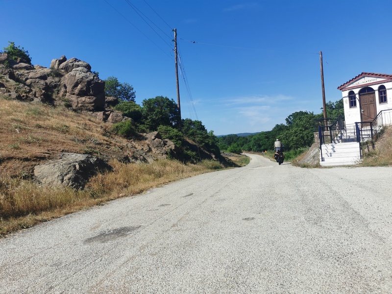 Auch der nächste Morgen überraschte uns mit einer wunderschönen Landschaft: Sobald wir wir das Hochplateau verließen, umwucherte dichtes Grün die Straße. Und tatsächlich, im Norden von Griechenland fuhren wir durch die bisher am dünnsten besiedeltste Gegend unserer bisherigen Reise. Als wir endlich doch auf ein Dorf stießen und unsere Lust auf Kaffee wuchs, teilte uns ein Dorfbewohner auf Deutsch mit, dass wir hierfür noch 20 Kilometer fahren müssten. Zwei weitere Dorfbewohner sprachen uns kurz an und gaben uns Ratschläge zu unserer Weiterfahrt, ebenfalls mit mehr oder weniger gutem Deutsch. Diese Erfahrung sollten wir nun noch häufiger machen, die Auffrischung unserer Englischkenntnisse kam damit ins Stocken, stattdessen konnten wir nun einmal Reinschnuppern, wie es sich für englische Muttersprachler anfühlen muss, die, egal wo sie hinkommen, in ihrer Sprache verstanden werden. Sehr viele Griechen waren zumindest für ein paar Jahre in Deutschland gewesen, hatten sich solide Sprachkenntnisse angeeignet und freuten sich, diese nun einmal wieder bei uns anwenden zu können.