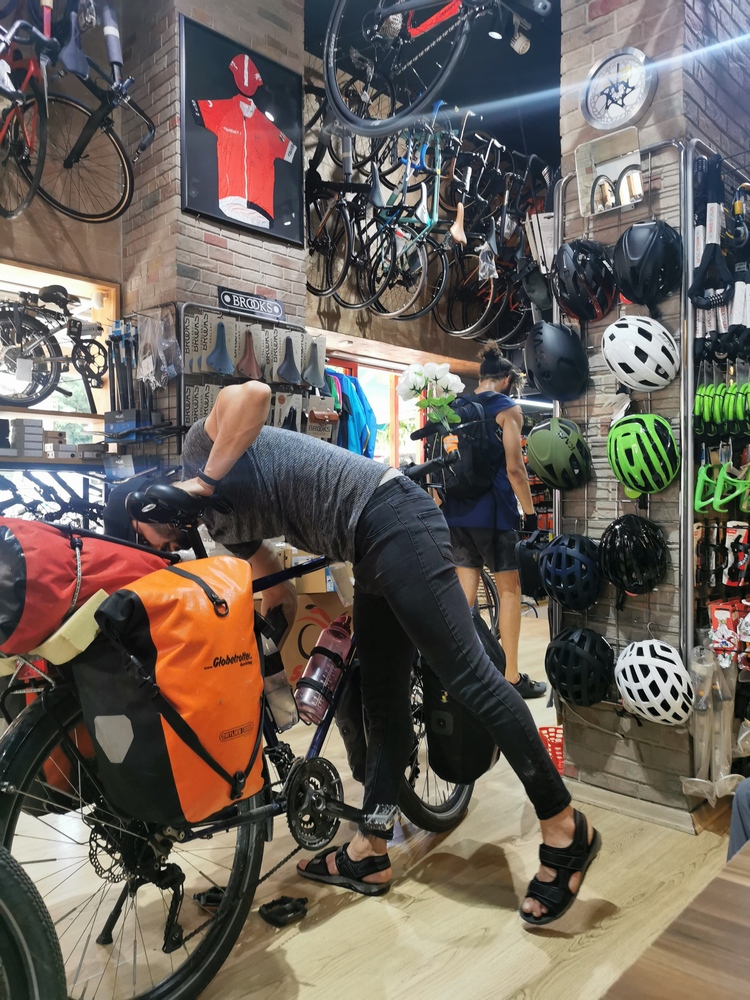Im asiatischen Teil von Istanbul geht es eigentlich etwas europäischer zu. Es ist weniger überfüllt, alles etwas entspannter, einige Parks, moderne Hipster-Cafés mit Kaffeevollautomaten und sogar Fahrradwege! Unsere Mission für die nächsten Tage war folgende: Wir blickten mit Respekt und diffusem Unbehagen auf das Höhenprofil, dass uns noch in der Türkei, Georgien, Armenien und dem Iran bevorstehen sollte und nahmen den Rat anderer Radfahrer*innen ernst, dass für Bergtouren SPD-Pedale ein effizientes Mittel zur Leistungssteigerung seien. So radelten wir nach einer kurzen Internet-Recherche nacheinander alle auffindbaren Fahrradläden in Istanbul ab (der asiatische Teil hat hier wesentlich mehr zu bieten), aber Pedale und Schuhe waren schwer zu finden. Schließlich ließen wir uns zumindest die neuen Pedale (Shimano SPD PD-M324) montieren, in der Hoffnung, in einem anderen Laden noch Schuhe zu bekommen.