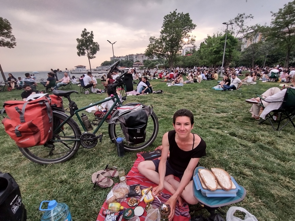 Für das Abklappern der ganzen Radläden benötigten wir länger als einen Tag und so beschlossen wir eine Nacht im Moda Park im Szeneviertel Kadiköy zu übernachten, um am nächsten Tag die Suche nach den Schuhen vorzusetzen. Der Park war voll mit jungen Menschen, die am Sonntagabend bei Efes und Miesmuscheln zusammen saßen. Wir mischten uns unters Volk, als wir jedoch gegen 12 Uhr müde wurden, sich die Wiesen aber kaum gelehrt hatten, laut gesungen und ein Volleyballmatch begonnen wurde, suchten wir uns einen vermeintlich ruhigeres Plätzchen in dem Park und legten uns einfach in unsere Schlafsäcke auf die Wiese. Dort wurden wir zwar grundsätzlich in Ruhe gelassen, Ruhe hatten wir aber keine. Istanbul ist wohl auch die Stadt die niemals schläft, das Party- und Sportprogramm ging bis in den Morgengrauen weiter und wurde dann nahtlos von ausgeschlafenen Istanbuler*innen wieder aufgenommen. Zwischendurch wurden wir auch noch ausgiebig von einem Straßenhund angejault, der aber der einzige sein sollte, der an unserem Verhalten Anstoß nahm. Obwohl wir mit unseren prächtigen Reiserädern schon an sich eine stattliche Erscheinung waren, und uns zudem mit aufwendigsten Speisezubereitungen und Taschenreperaturmaßnahmen beschäftigten, schien niemand von uns ernsthaft Notiz zu nehmen. Istanbul hat so viele Facetten der menschlichen Lebensgestaltung zu bieten, dass wir keinerlei Aufmerksamkeit erregten. Lediglich ein junger Brite hatte uns ein paar Stunden vorher angesprochen, da er selbst nach einer Radtour in Istanbul hängen geblieben war und hatte uns bestätigt, dass eine Übernachtung unter freiem Himmel sicher sei und niemanden stören würde.