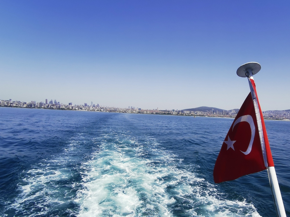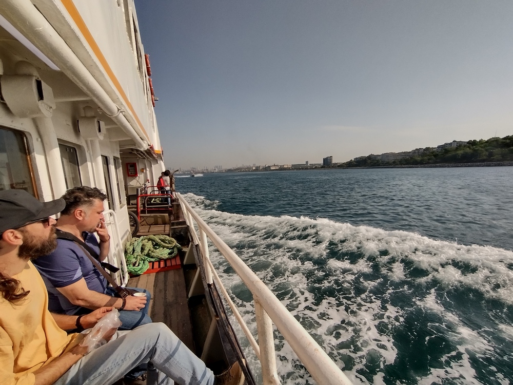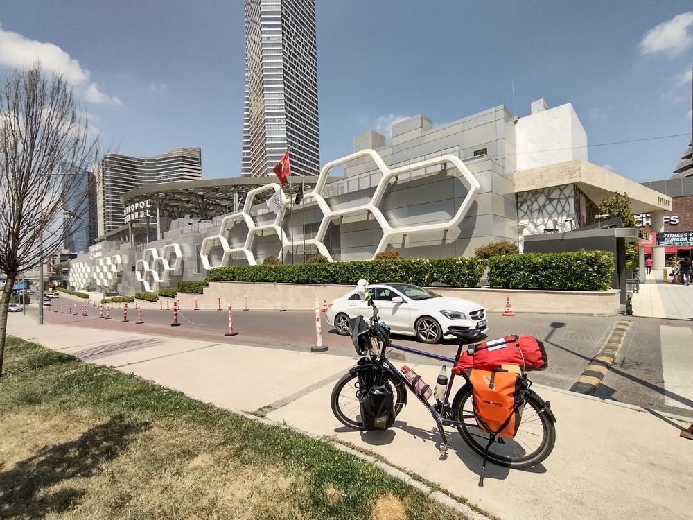 Am nächsten Morgen packten wir auch früh zusammen und wollten nun endlich wieder mit Vollgas zurück auf die Straße. Zunächst war freilich eine weitere Fährfahrt zurück aufs Festland erforderlich, die uns durch das Geleit einer Delfinherde versüßt wurde. Istanbul auf dem Landweg zu verlassen konnten wir nicht ohne noch einmal bei einem Decathlon in einer weiteren monströsen und diesmal menschenleeren Mall erfolglos nach Fahrradschuhen zu fragen. Stattdessen kauften wir eine schlecht funktionierende Power-Bank bei Media-Markt und wollten noch in Ruhe ein Mittagessen im Food Court einnehmen, als mehrere Kaufhaus-Cops mit Cityrollern auf uns zukamen und uns als diejenigen in dieser kilometerlangen Mall mit 3 Stockwerken identifiziert hatten, die ihre Fahrräder verbotenerweise einfach im Gang neben den Aufzügen abgestellt hatten. So schlangen wir unseren Bulgur und gekochtes Gemüse hinunter, um das etwas nervös wirkende Personal von dieser Last zu befreien.