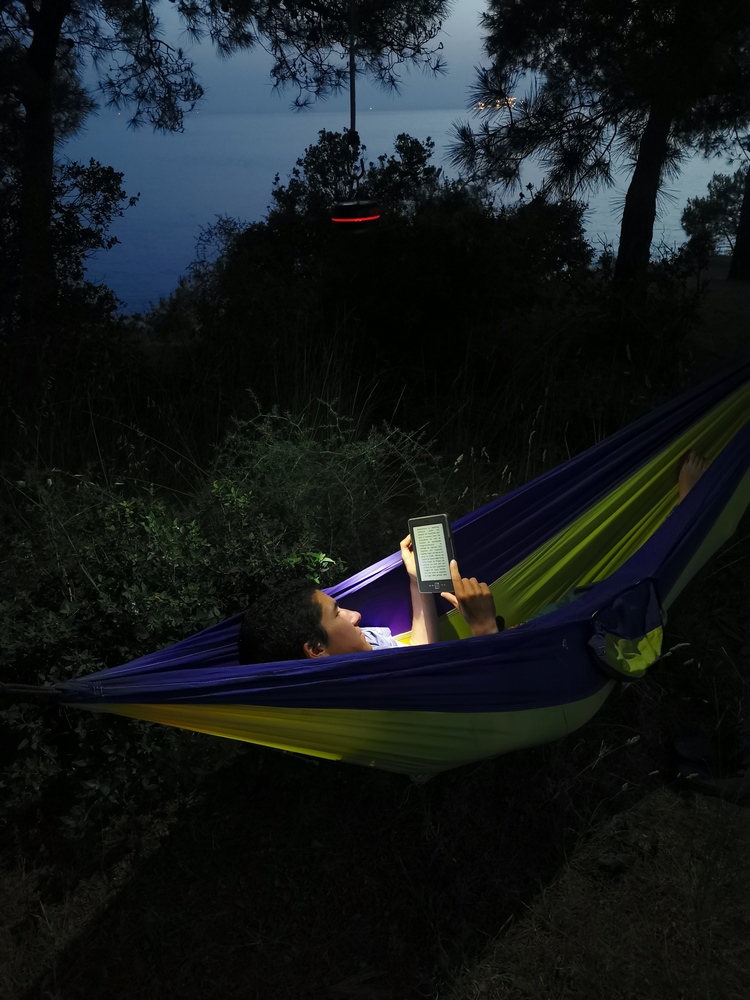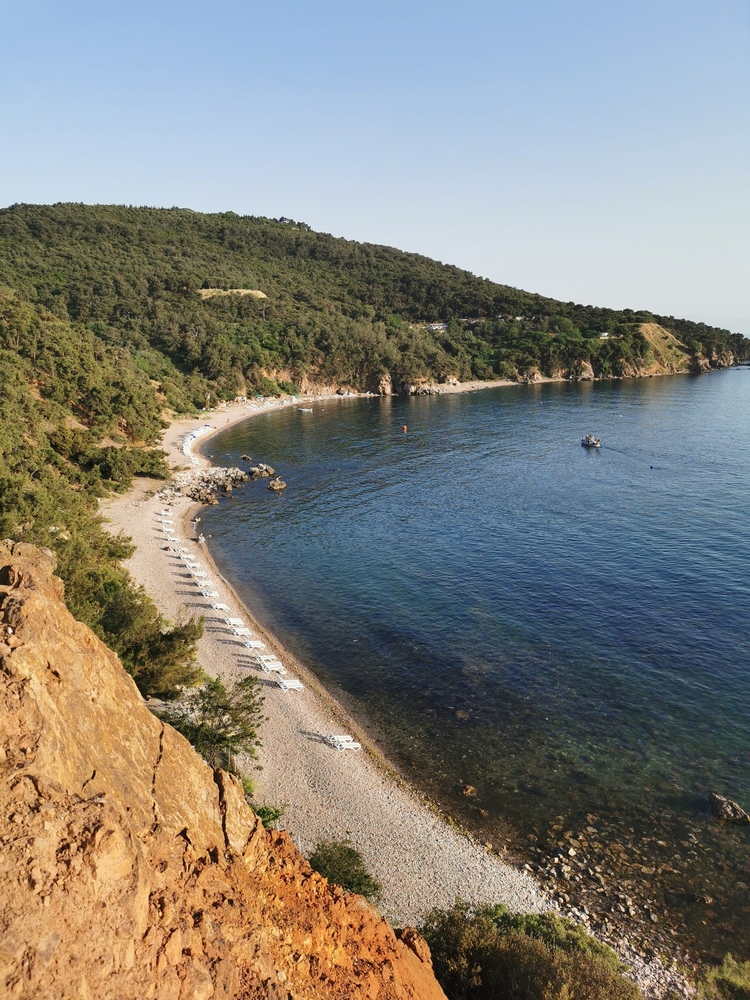 Auch der nächste Tag sollte uns keine passenden Fahrradschuhe finden lassen, aber immerhin konnten wir auf dem Weg zu einem Fahrradladen über 10 km auf dem herrlich ausgebauten Küstenradweg von Kadiköy nach Bostancı folgen. Als es dann gegen Mittag aber schon sehr heiß war und wir nach der Nacht im Park nicht wirklich ausgeruht waren, beschlossen wir einem Tipp zu folgen, den wir über einen Kontakt über warmshowers bekommen hatten: Auf einer Istanbuler Insel könne man in einer schönen Bucht wild campen. Wir versprachen uns dort auch ein bisschen Erholung bevor wir die anstrengende Fahrt aus der Stadt heraus antreten wollten. Mittlerweile waren wir schon länger in der Stadt, als geplant, sie hielt uns fest wie ein babbiges Guzel oder klebriger Baklava. Durch zahllose Einbahnstraßen bahnten wir uns mehr schlecht als recht den Weg zur nächsten Fähre und setzen über nach Burgazada. Dort ging es schon sehr viel gemütlicher zu, keine Autos und viel weniger Menschen. Wir radelten am Marmarameer entlang Richtung dem versprochenen inoffiziellen Zeltplatz. Dort angekommen entdeckte Julia einen kleinen Pfad der zu einem Platz unter Bäumen und über der Bucht führte, schön schattig und leicht mit den Rädern erreichbar war. Bei der anschließenden Begehung des Strandes entdeckten wir noch einige zerstreut herumstehende Zelte; die Szenerie mutete wie eine Hippie-Kommune an. Mangels Schatten spendender Bäume am kiesigen Ufer beschlossen wir aber auf der Anhöhe zu bleiben. Dies sollte sich nachher noch als fragwürdige Entscheidung herausstellen. Zunächst aber legten wir einen Mittagsschlaf in der Hängematte ein und installierten unsere Solardusche (zum zweiten mal auf unserm Trip).