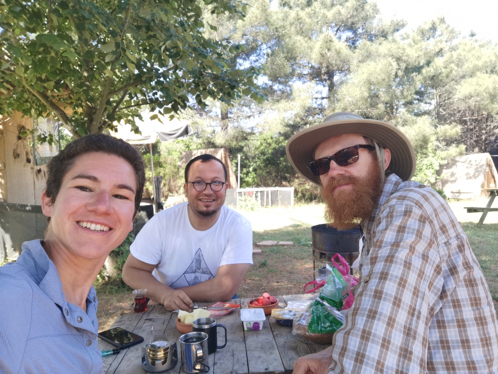 In Sahilköy angekommen waren wir jedoch ein wenig enttäuscht, denn der erste Strand, auf dem wir zelten wollten, stellte sich als nicht besonders einladende Wüstenlandschaft heraus und da die Sonne noch eine Weile brauchen würde um nahe des Horizonts an Strahlungsenergie zu verlieren, entschieden wir uns doch lieber den nächstgelegenen baumbestandenen Campingplatz im nahegelegenen Dogancili aufzusuchen. Nach etwas Gefeilsche mit dem Campingplatzbetreiber (bei dem wir unsere Entschlossenheit mit einer angetäuschten Weiterfahrt untermauerten) erschien uns der Preis von 100 TL (gut 6 Euro) vertretbar, wenn auch der Platz einen ungepflegten und lieblos gestalteten Eindruck erweckte und er ebenso wie die umgebende Natur leider nicht frei von Müll war. Von unserem Zeltnachbar wurden wir sogleich zum Cay eingeladen, er hatte durchgehend ein kleines Feuer brennen und darauf die typische türkische Teekanne „Çaydanlık“, bestehend aus dem unteren Wasserkocher und dem darauf sitzenden Teebehälter, stehen. Als es um unsere Weiterreise ging, übersetzte der Google-Translator einen Satz von Turan vermutlich fälschlicherweise mit „Ihr müsst euer Ziel im Blick behalten“. Wir waren etwas verdutzt über diese Ermahnung, aber mussten zugeben, dass er damit einen wunden Punkt traf. Das sehr bruchstückhafte Englisch erschwerte ein ausführliches Gespräch, trotzdem freuten wir uns einmal mehr über die besondere Gastfreundschaft der Türken.