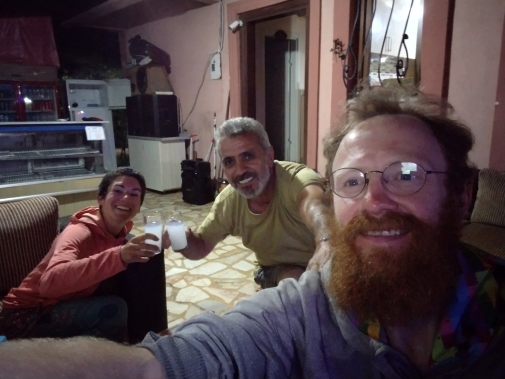 Auch der Nachtwächter des Campingplatzes suchte gleich Kontakt zu uns und nachdem er uns darauf hingewiesen hatte, dass wir nicht auf unserem Kocher (den Tilmann gerade im Begriff war von Gas- auf Benzinbetrieb umzubauen), sondern auch in der platzeigenen Küche kochen könnten, luden wir die beiden zum Essen ein. Der Nachtwächter stimmte zu und obwohl dieser kein Wort Deutsch oder Englisch und wir nur drei bis fünf Wörter Türkisch konnten, bestand er darauf ohne Google-Translator auszukommen, was wir sehr sympathisch fanden und versuchten mit Zeichensprache zu sprechen. Bei anschließendem Fanta, Wein, Bier, Raki, Sagalm (Steckrübensaft) und Zigaretten wurde über Familie, Wirtschaft und Politik gesprochen, doch wahrscheinlich verstanden wir nur ca. 10 Prozent von dem richtig, was er uns sagen wollte, obwohl er jede seiner Aussagen mit der Frage „Anliyor musun?“ („Verstehst du?“) abschloss. Ein Wort das häufig viel, hört sich für uns an wie „Kreissparkasse“, aber wahrscheinlich wollte ein türkischer Campingplatzaufseher nicht mit uns über das deutsche Bankenwesen sprechen. Anscheinend schloss er Tilmann irgendwie dennoch tief in sein Herz, schenkte ihm zwei Misbahas (Gebetsketten) und umarmte und küsste ihn mehrfach. Es ist jedoch nicht auszuschließen, dass hierbei aber auch der Raki seine Finger im Spiel hatte.