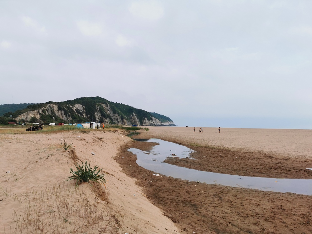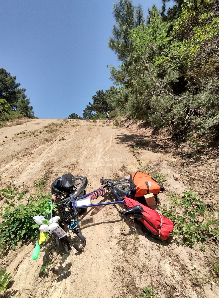Die Schwarzmeerküste sollte uns leider auch am nächsten Tag nicht überzeugen. Wir hatten uns nicht genug Zeit genommen, um uns die Route im Detail anzuschauen und mussten jetzt feststellen, dass die Straße an der Küste aus einem ständigen Auf- und Ab bestand, jeweils sehr steil, sodass man sich hoch extrem abmühte, nur um sich nicht auf die Abfahrt freuen zu können, da man den Bremshebel bis zum Anschlag ziehen musste. An einem besonders steilen Abhang auf losem Untergrund legte Tilmann schließlich noch einem filmreifen Stunt hin, indem er gekonnt vom Fahrrad sprang bevor dieses umstürzte. Julias Fahrrad schoben wir anschließend gemeinsam hinunter. Bei diesem Abschnitt des Weges handelte es sich um eine Ausprägung „avoiding-the-mainroad-Phänomes“ von komoot, das in diesem Fall nicht nur eigentlich überflüssig sondern ganz und gar unsinnig war. Wir können diese inzwischen zwar regelmäßig treffsicher erkennen und korrigieren, diesmal war sie uns jedoch bei der Prüfung der Route durch die Lappen gegangen.