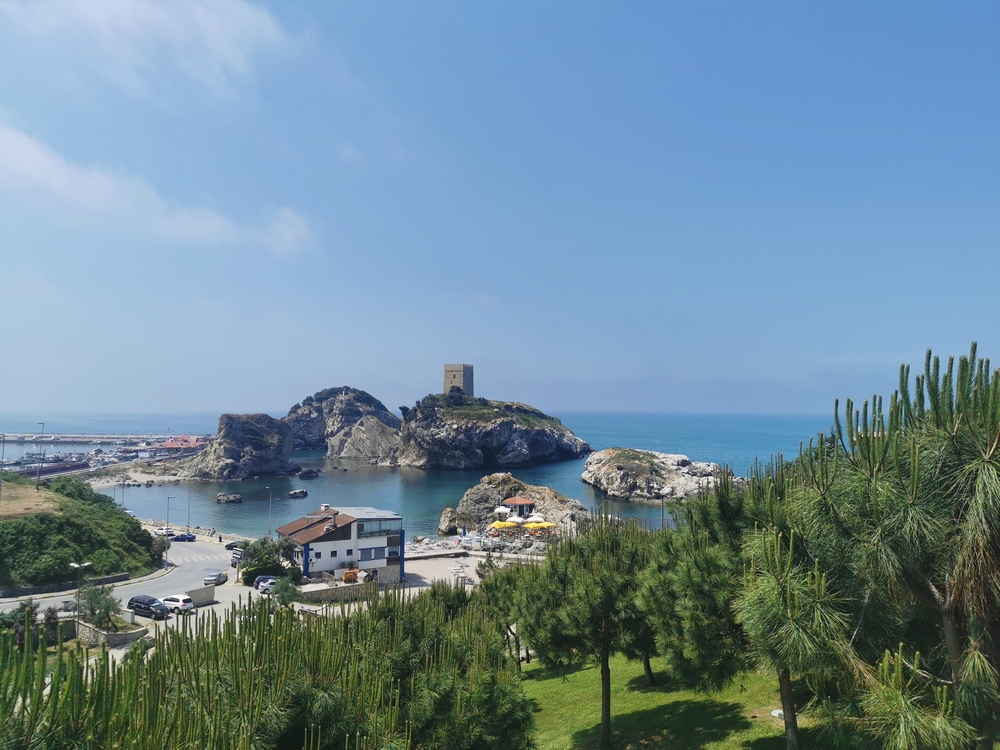 Zu diesen Ärgernissen hinzu kam der Umstand, dass das Meer eigentlich kaum zu sehen war, weil man nicht direkt an der Küste fuhr. Stattdessen kreuzten wir immer wieder ein nicht vollendetes Autobahnprojekt, dessen Vollendung uns sicher dazu bewegt hätte dessen Trassenführung zu folgen, um entspannter vorwärts zu kommen. So weit war es mit uns schon gekommen, denn nach einem erneuten mörderischen Anstieg in der prallen Sonne nach Sile fühlten wir uns nicht mehr nur leicht blümerant sondern ernsthaft mitgenommen und auch zwei eiskalte Cola schafften kaum Abhilfe. Nun befanden wir uns auf den Klippen etwa 60 Meter über dem Meer und konnten dennoch die Aussicht nicht genießen, da diese den Terrassenrestaurants vorbehalten war, deren Baustruktur zwischen uns und dem Fernblick auf die See lag. Beim Verlassen der Stadt erhaschten wir zwar noch einen Blick auf die vorgelagerte Burg auf den Klippen, der uns aber auch nicht vom Hocker riss.