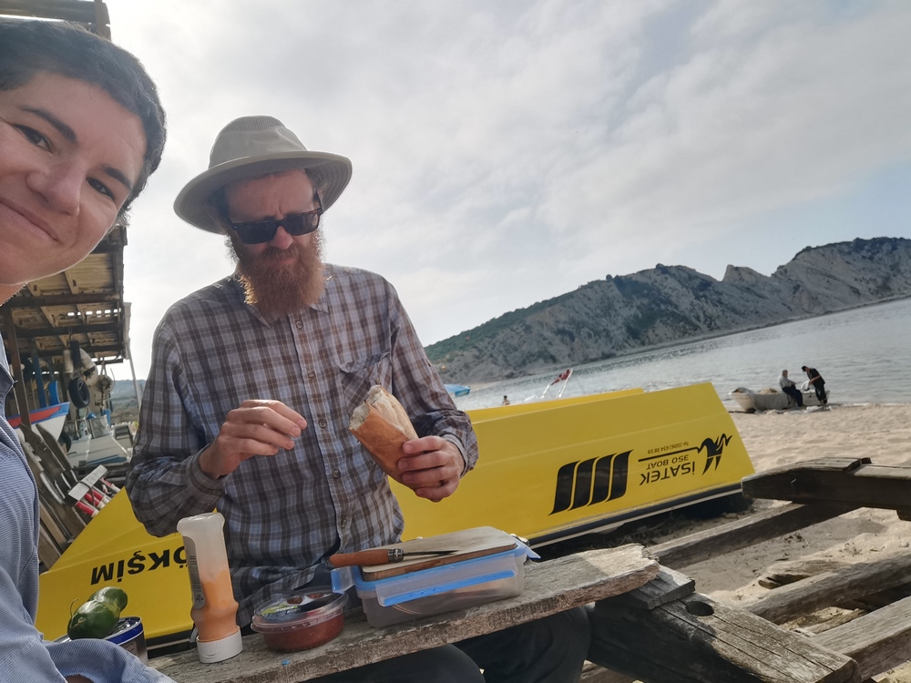 Als wir gegen halb sechs am Morgen erwachten und unsere Gehörgänge vom Oropax befreiten, glaubten wir unseren Ohren nicht zu trauen: Anscheinend fand gerade auf diesem verlassenen Strand ein Fußballspiel statt. Bisher waren wir daran gewöhnt, dass in der Türkei alles etwa 2 Stunden später stattfindet, als in Deutschland: Wochenmärkte und Supermärkte öffnen zum Beispiel frühestens um 9. Auf dem Strand hatten sich irgendwann in der Nacht von uns unbemerkt 10 junge Männer eingefunden, die ihre beiden Zwei-Mann-Zelte aufgeschlagen hatten. Die Schlafplatz-Rechnung ging offenkundig nicht auf, was wohl der Grund dafür war dass sie sich nun mit Fußball und lauter Partymusik wach zu halten gedachten. Das Unterfangen wurde durch die Aufnahme von Koffein in kurzen Teezeremonie unterstützt.