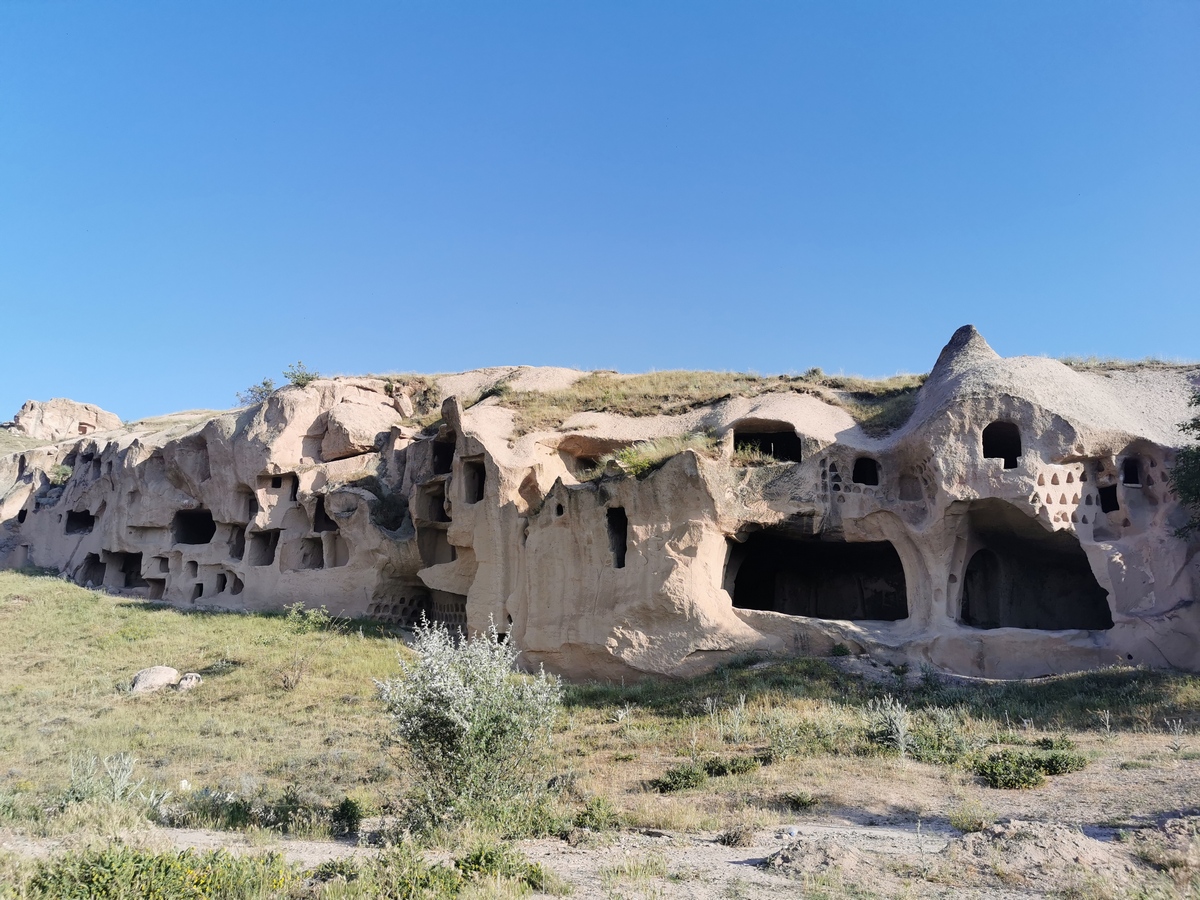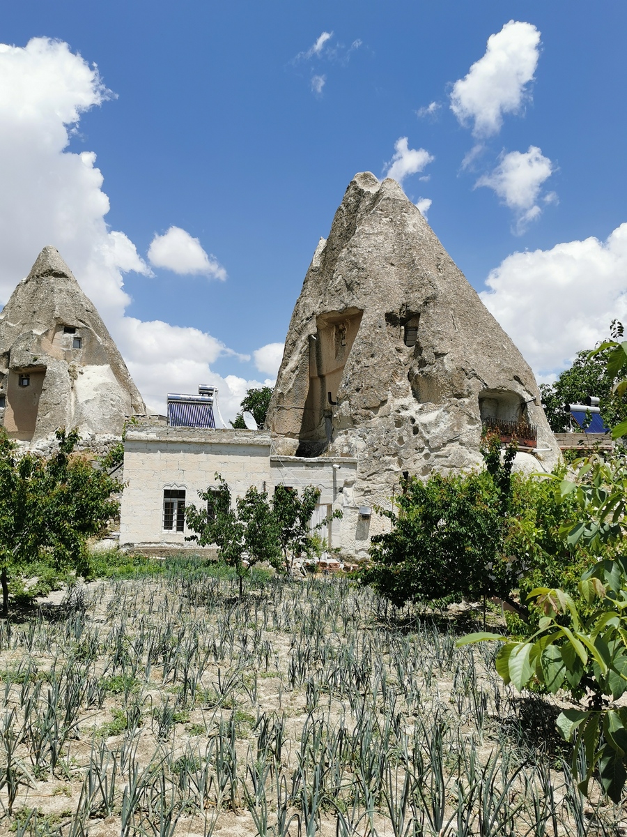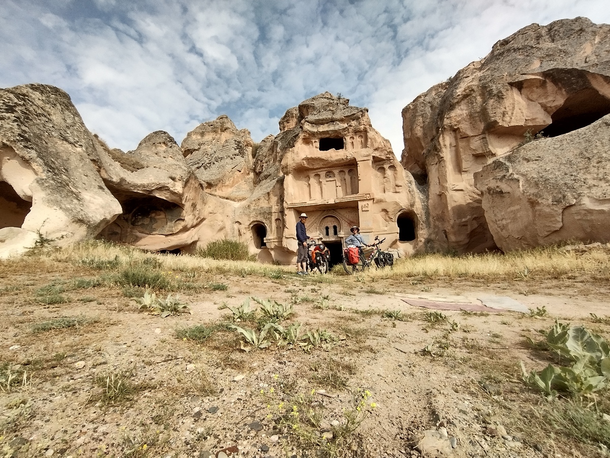 Am Nachmittag des 12. Juni, Tag 71 unserer Reise, erreichten wir endlich die Region Kappadokien. Bereits auf dem Weg dorthin säumten interessante Felsformationen den Weg, in manchen waren auch von Menschen geformte Höhlen zu erkennen. Im Dorf Büyükkayapa wurden diese auch noch ganz regulär als Ställe, Werkstätten und Lagerräume genutzt. Leider hielten wir dort nicht an, da Tilmann der Meinung war, dass nun jedes Dorf so aussähe, was sich schon beim nächsten Ort als Irrtum erwies. Schließlich erreichten wir in Gülsehir den Geopark Kappadokien. Dort mussten wir nicht mehr lange suchen um eine erste in den Fels gehauene Stadt zu entdecken, die am Rande der neuen Stadt lag und sich keinerlei Aufmerksamkeit von irgendwem außer uns erfreute. Für uns war es ein faszinierender Anblick und wir erkletterten uns einige der Höhlenhäuser. Wären an dieser jahrtausendealten UNESCO-Welterbestätte nicht zahllose Bierdeckel, Scherben und Plastiktüten gelegen, hätten wir dort auch übernachten können. Denn einen besonderen Schutz bzw. eine Überwachung gab es hier nicht. Da wir aber auch ein bisschen Komfort bevorzugen, fiel unsere Schlafplatzwahl schließlich auf den Vorplatz der St. Jean Kirche.