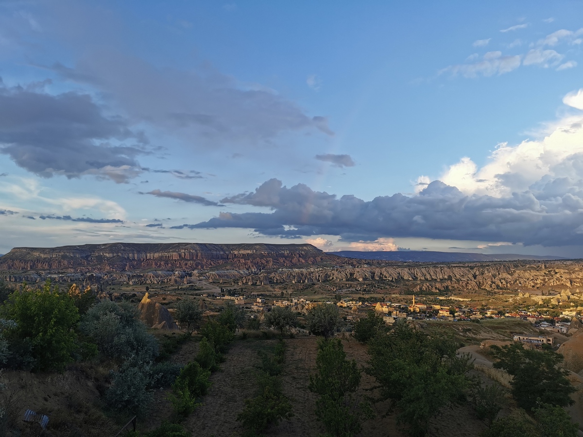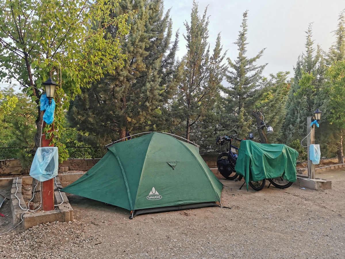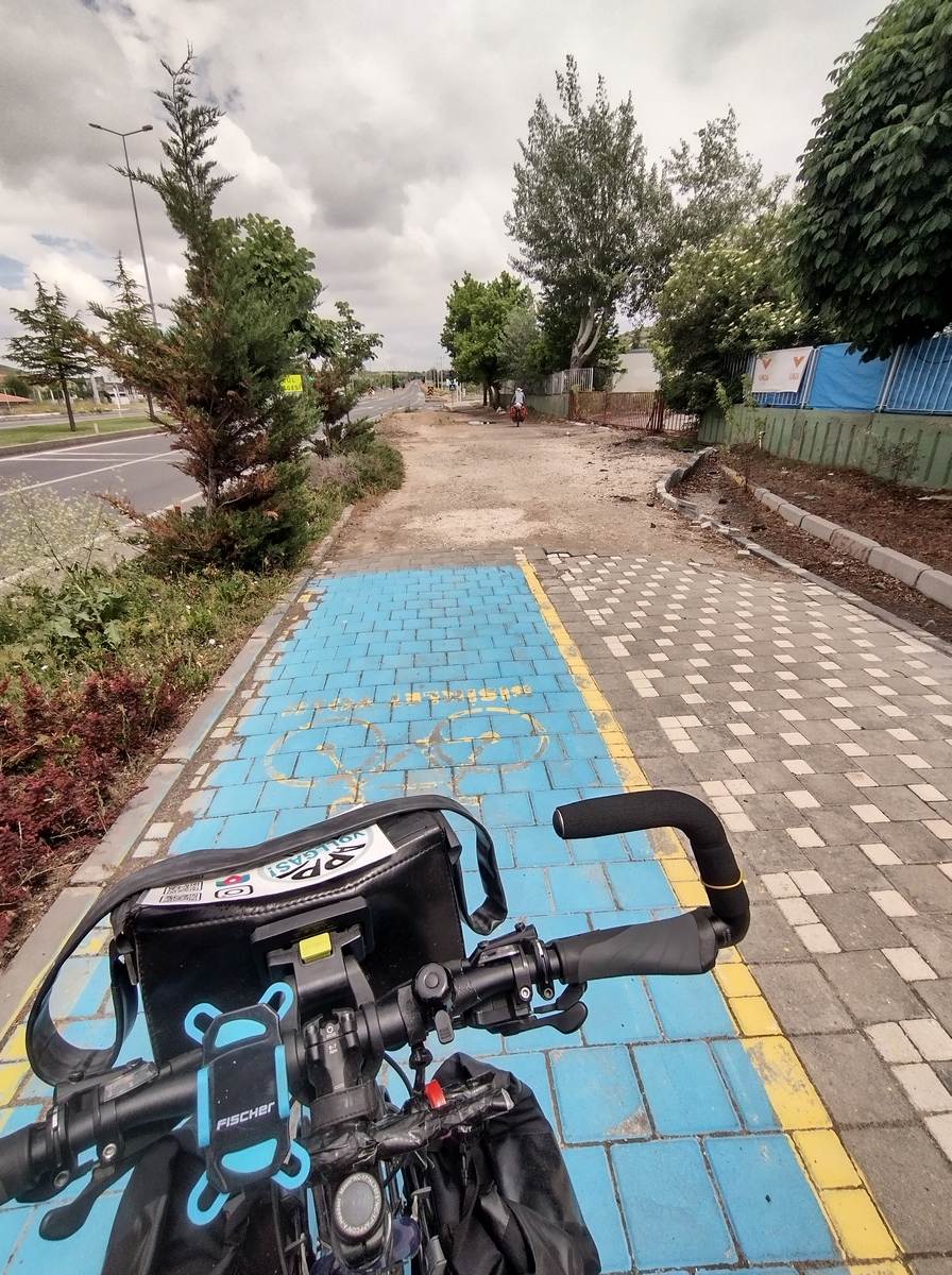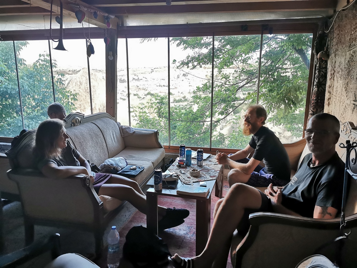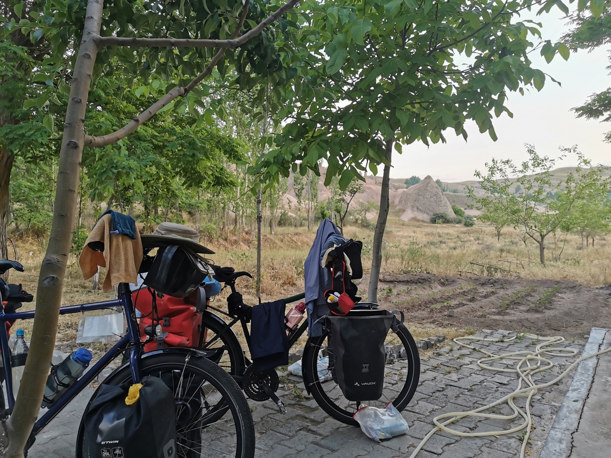 Erneut türmten sich Gewitterwolken über uns, aber wir schafften die 10 Kilometer bis in die Provinzhauptstadt Nevsehir unversehrt und gerade rechtzeitig in den einzigen Fahrradladen, als es zu regnen begann. Ein letzter Versuch Klick-Schuhe zu ergattern bescherte uns eine Einladung zu einem schwarzen Filter-Kaffee in einer großen Tasse! Sowas hatte es seit Istanbul nicht mehr gegeben und auch in Istanbul war der kredenzte „Americano“ nicht besonders schmackhaft. Doch der Fahrradhändler servierte uns einen astreinen „normalen“ Kaffee und hatte uns damit natürlich direkt um den Finger gewickelt. Julia bestellte Schuhe und man verabredete sich in drei Tagen wieder zu sehen. Nach dem Regenguss brachen wir auf zum Campingplatz Panorama in Göreme, wo Kathrin bereits seit einigen Tagen verweilte und auf uns wartete. Ein freudiges Zusammentreffen stand uns bevor, nachdem wir uns zuletzt in Istanbul im Morgengrauen nach einer ausgiebigen Party-Nacht verabschiedet hatten.