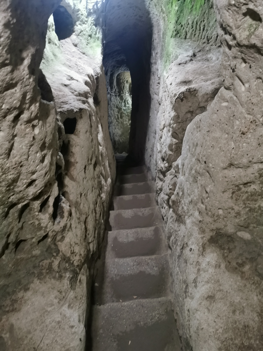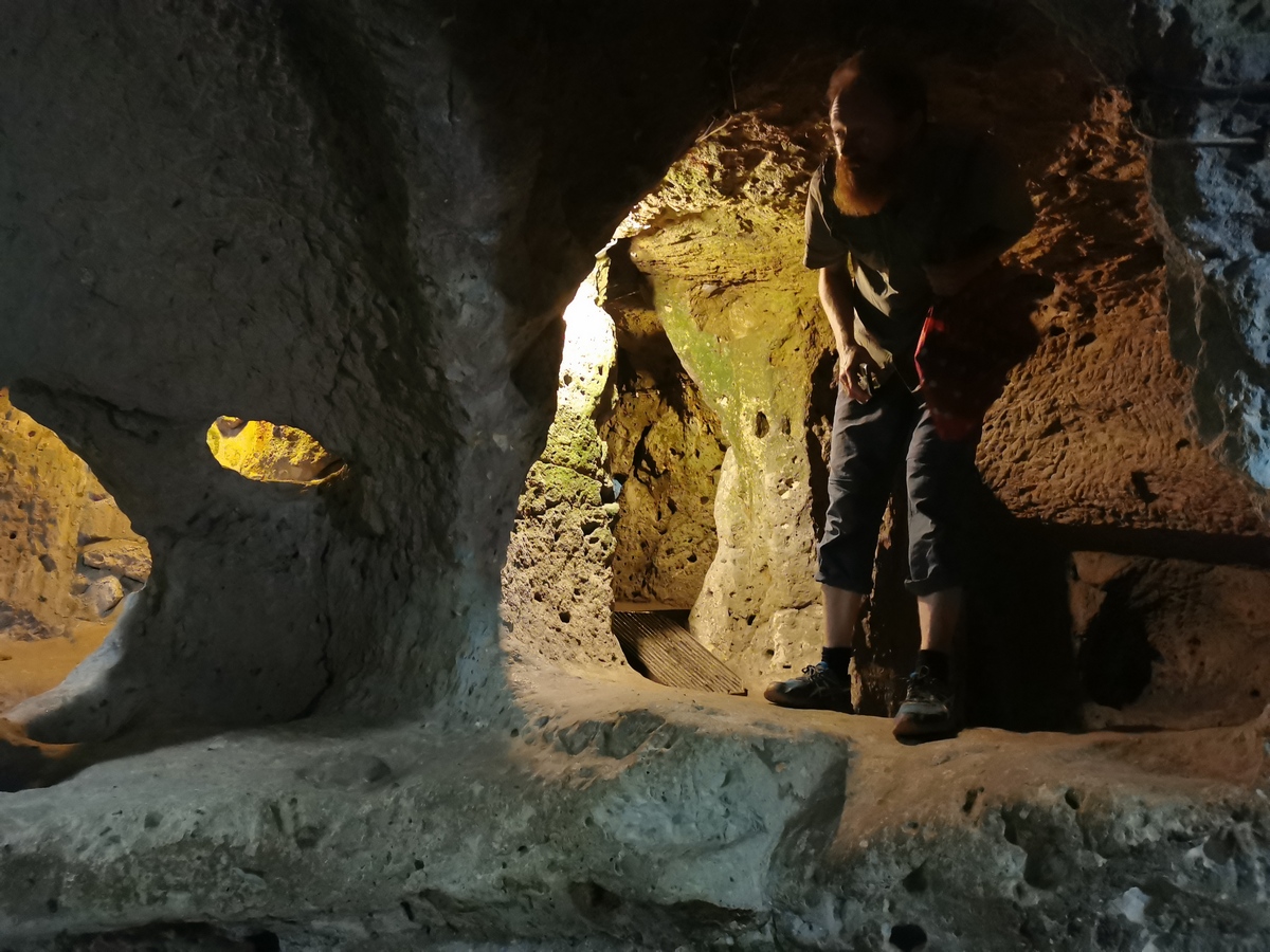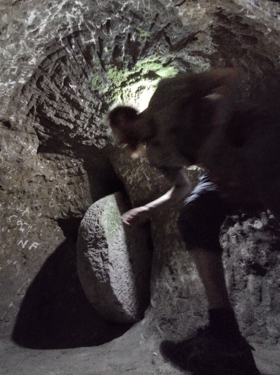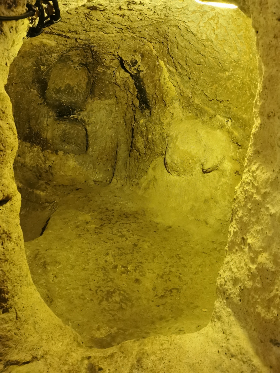 Am zweiten Tag hatte uns der Regen auch in Kappadokien eingeholt und so fuhren wir mit einem Pärchen aus der Schweiz die unterirdische Stadt Derinkuyu besichtigen. Da diese rund 30 km südlich von Nevsehir liegt, waren wir froh, dass die beiden uns in ihrem Landrover mitnahmen. Derinkuyu ist die bekannteste und gleichzeitig die größte der Öffentlichkeit zugängliche Untergrundstadt in Kappadokien. Der Besuch war verrückt. Die Stadt war und ist ein Labyrinth aus unzähligen Tunneln und kleineren und größeren Kammern. Einige sind so niedrig, dass man auf allen Vieren hindurch krabbeln muss. Es geht ständig rauf und runter, links und rechts und um Kurven, sodass man in kürzester Zeit vollkommen die Orientierung verliert. Zwar soll sich der Komplex eigentlich in Stockwerke untergliedern, aufgrund einer Vielzahl von Zwischenebenen und sehr unterschiedlichen Distanzen zwischen diesen, ist es kaum möglich nachzuvollziehen auf welchem Level man sich befindet. Klaustrophobischen Menschen sei dringend von einem Besuch abgeraten, aber die Szenerie ist eigentlich für jedermann als Kulisse für einen Albtraum geeignet.