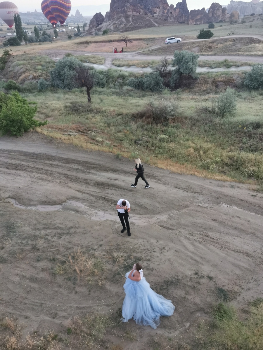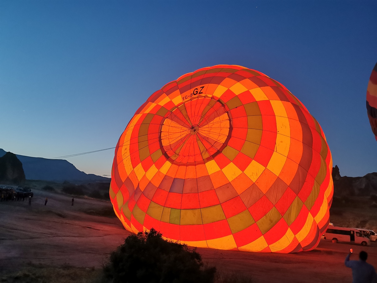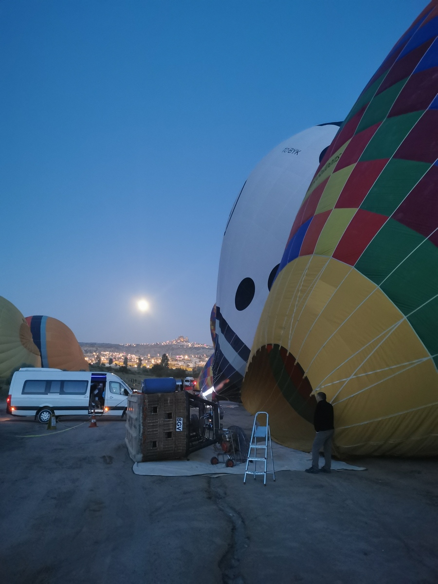 Obwohl wir uns wegen der horrenden Preise bereits vorab gegen einen Ballonflug entschieden hatten, ließ sich Julia von der Stimmung auf dem Campingplatz mitreißen. Reisende, die bereits in der Luft waren, schwärmten davon und überzeugten erst Kathrin, dann Thomas und schließlich auch Julia, dass die 150 Euro ihr Geld Wert wären. Jeden Morgen steigen über Kappadokien ca. 160 Ballons auf. Vor ca. 30 Jahren wurde die erste Ballonfahrt angeboten und mittlerweile sind die Ballons zu einer der Hauptattraktionen hier geworden. Natürlich kann man von dem Ballon aus die spektakuläre Landschaft wunderbar sehen, allerdings wollen mittlerweile alle die Landschaft einmal vom Ballon aus sehen und dann noch die Landschaft mit den Ballons. Deshalb vollzieht sich jeden Morgen ab 3:30 Uhr in der Früh ein irres Spektakel. Ca. 160 Ballons werden mit großen Pick-Ups durchs Tal transportiert, ca. 3.000 Passagiere (20 pro Ballon) werden mit Kleinbussen bei ihren Unterkünften eingesammelt, Touristinnen in Ballkleidern werden in Oldheimern zu guten Fotospots gefahren für das perfekte Bild mit Balloons im Hintergrund. Um ca. 5 Uhr steigen die Ballone auf, da es um diese Uhrzeit die günstigsten Windverhältnisse gibt.