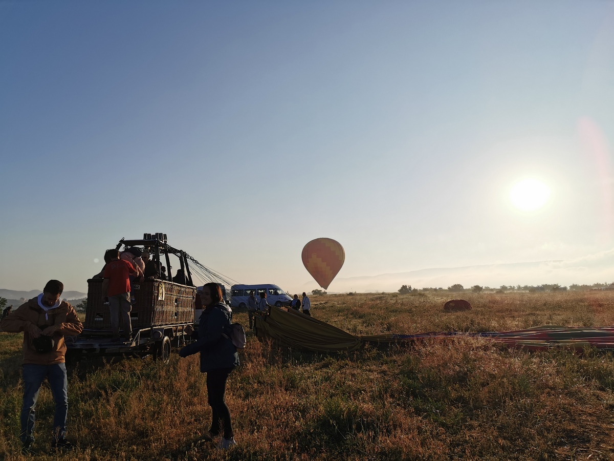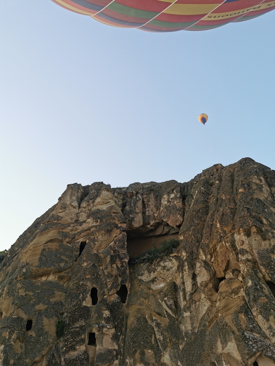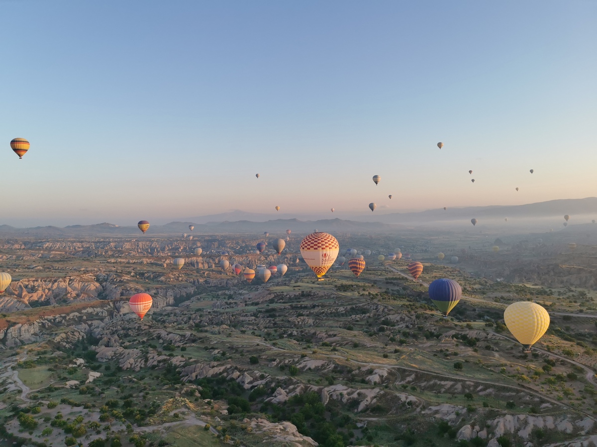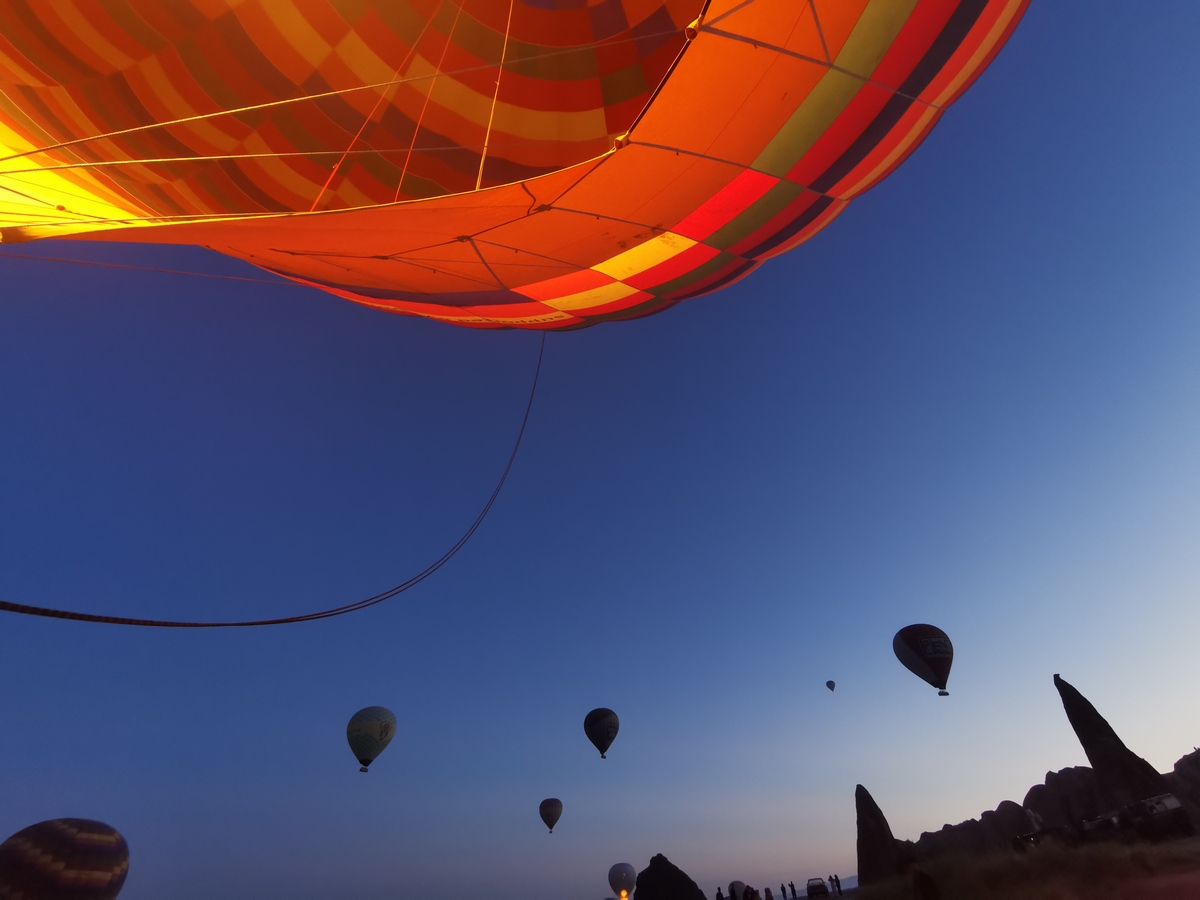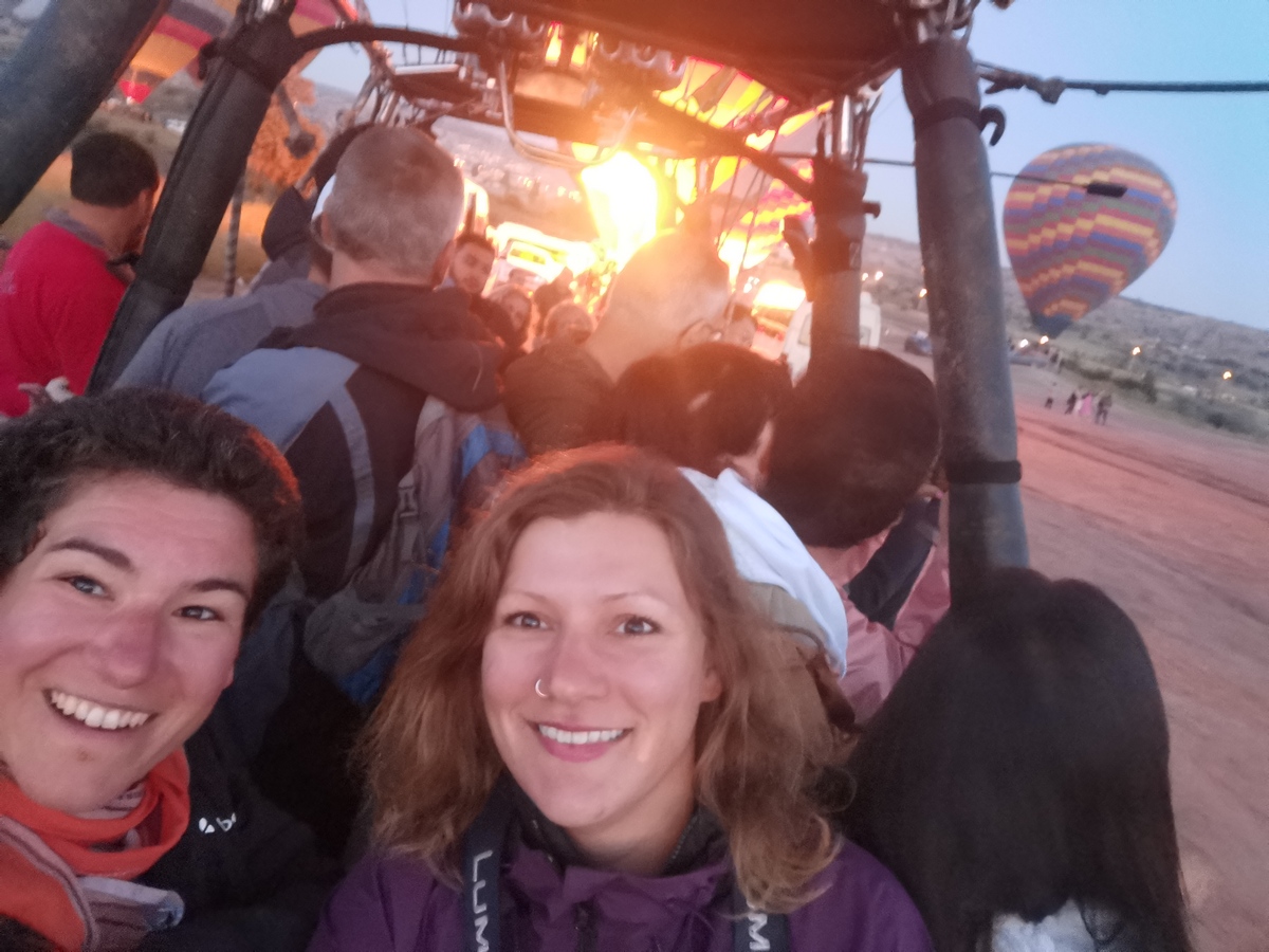 Besonders faszinierend ist, wie die Ballons noch im Dunkeln langsam aufgeblasen werden und ihre Farben in der Dämmerung erblühen, sobald die Gasflamme sie erhellt. Langsam wachsen die birnenförmigen Körper und vor lauter Faszination hätten Julia und Kathrin beinah ihren Ballon verpasst, sprangen dann aber noch schnell in den mit Menschen vollgestopften Korb. Sanft stieg der Ballon in den Himmel hinauf, ein sehr angenehmes Gefühl. Während der Ballon-Fahrt ging die Sonne über Kappadokien auf, umgeben von den vielen anderen Ballons schwebten wir durch die Täler und stiegen auf 400 Meter auf.