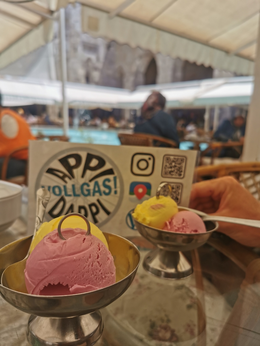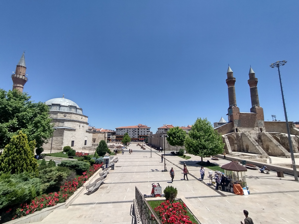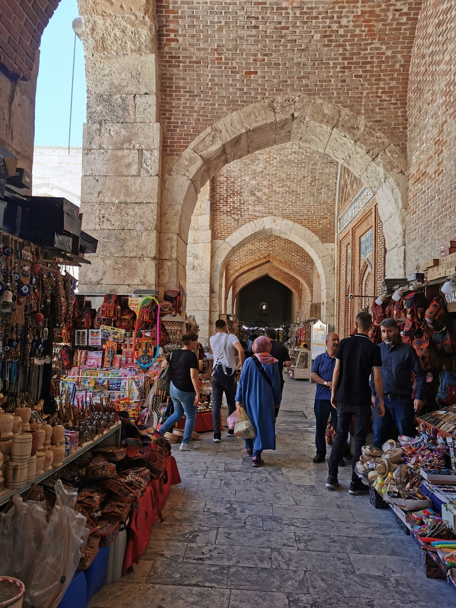 Den Vormittag verbrachten wir mit einer kurzen Sightseeing-Tour zu den drei alten Gebäuden der Stadt (Moschee, Karawansarei und Basar) und kauften uns einen kleinen handgeschnitzten Kangal, einen handgemachtes Portemonnaie und zwei Eheringe, die wir uns gegenseitig in unseren Eisbecher steckten. Die Eheringe sollten als zukünftiger Beweis dienen, sollten wir einmal wieder bei einer Unterkunft nach unserem Familienstand gefragt werden. Die Erklärung, dass es in Deutschland mögliche ist unterschiedliche Nachnamen zu haben, wurde bisher akzeptiert, doch um keinen Misstrauen zu wecken, wollten wir zumindest mit Ringen den Anschein erwecken, dass unsere Verbindung ordnungsgemäß ist und uns deshalb auch ein Doppelzimmer zusteht.