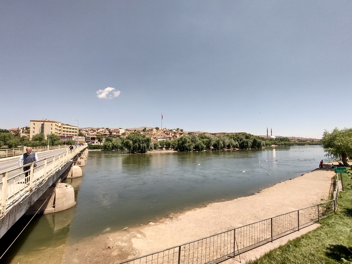 Da das Radfahren vor diesem Hintergrund gerade einmal wieder besonders viel Spaß machte, verzichteten wir auf einen nahezu perfekten Zeltplatz an einem Brunnen etwas abseits der Straße und machten noch ein paar Kilometer bis in den kleinen Ort Karaözü gut. Dort zelteten wir direkt neben einer offenbar in die Jahre gekommenen Brücke (denn sie war nur noch für den Fußverkehr freigegeben) über den Kızılırmak. Offenbar befanden wir uns überraschenderweise in einem Ort mit sehr modernen Einwohnern, denn alle Damen egal welchen Alters, die wir auf der Straße trafen, waren ohne Kopftuch unterwegs. Leider war der Weg in die Moderne jedoch noch nicht so weit vorangeschritten, dass auch das Umweltbewusstsein bereits gereift wäre. So leistete Julia erst einmal ein bisschen Gemeindearbeit bevor wir es uns gemütlich machen konnten und sammelte Bierdosen und Plastikflaschen ein.
