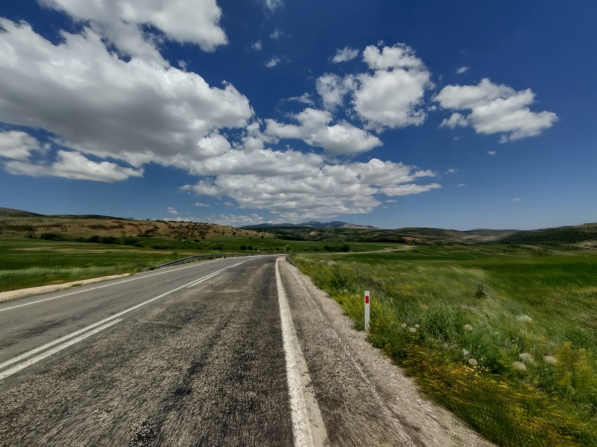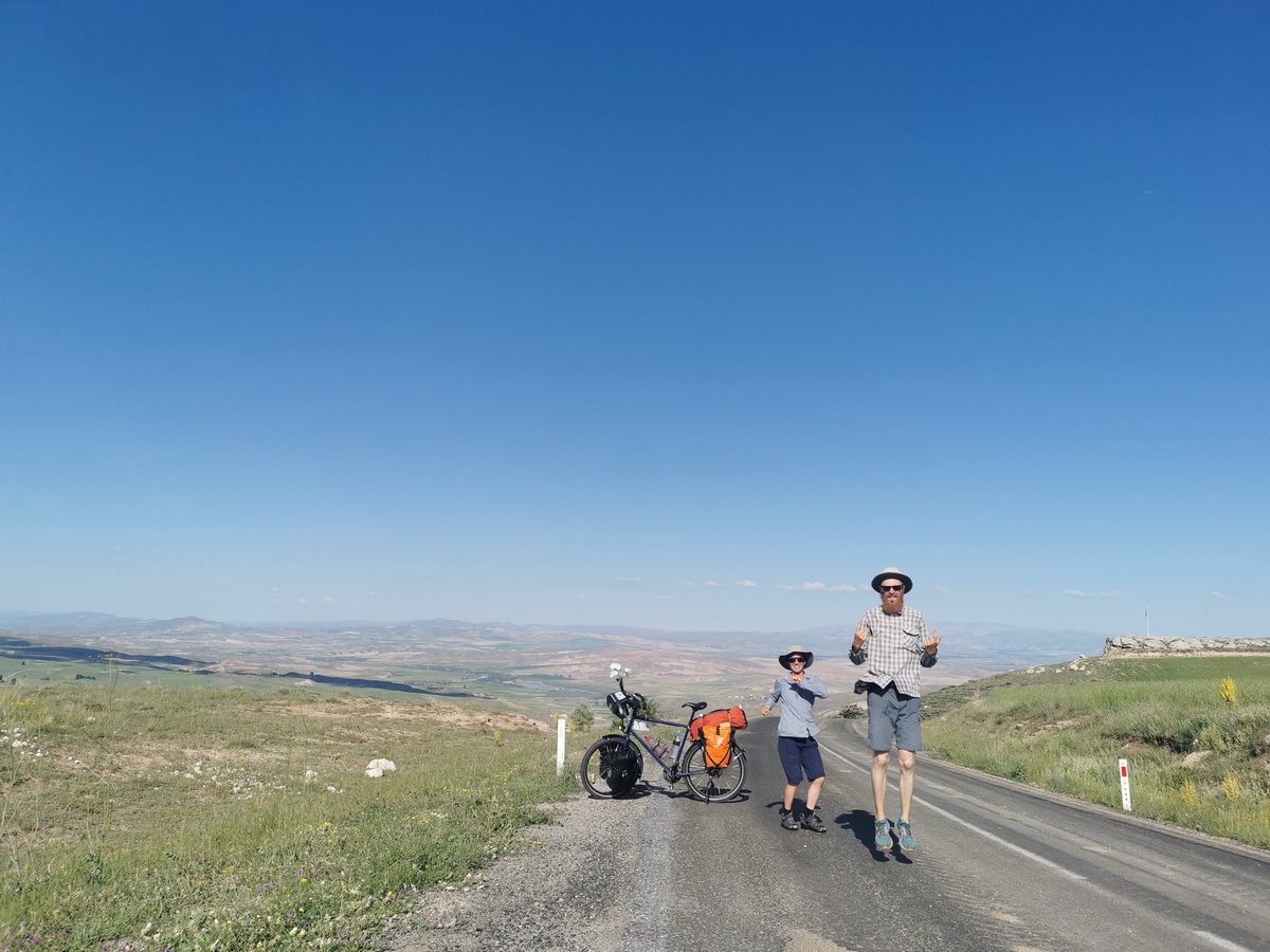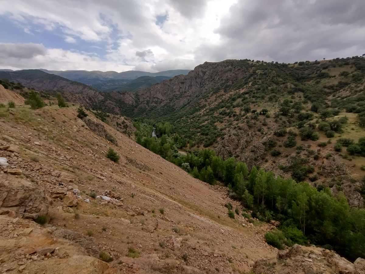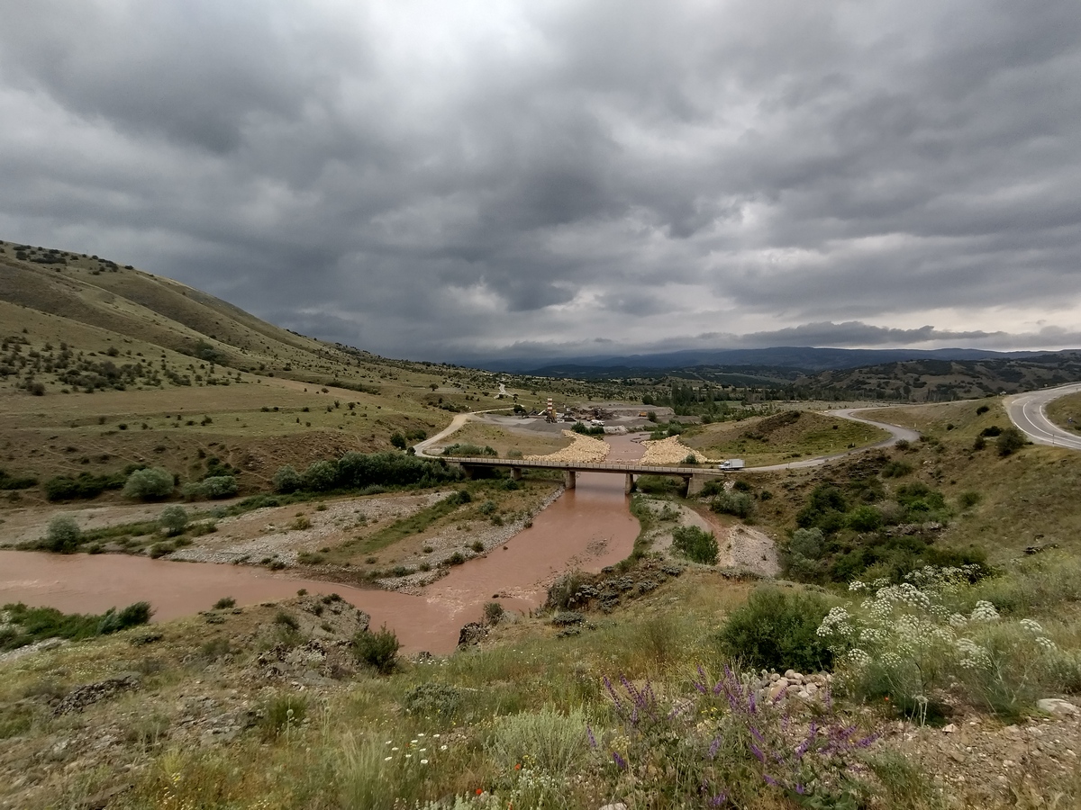 Am Nachmittag erreichten wir das Ak Gebirge, welches im Süden vom Kızılırmak begrenzt wird. Wir folgten aber grob weiter dem Flussverlauf und drangen nicht tiefer in die Berge vor. Stattdessen erreichten wir nach einem heftigen Anstieg, den wir mit einer Pause unterbrachen und diese nutzen, um Julias Bremsbeläge am Hinterrad auszutauschen, hinter der Ortschaft Özvatan eine Geländekante, die uns abermals eine beeindruckende Aussicht und eine etwas holprige und rasante Abfahrt bescherte.