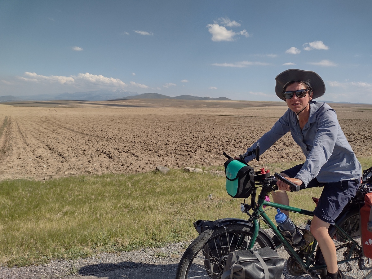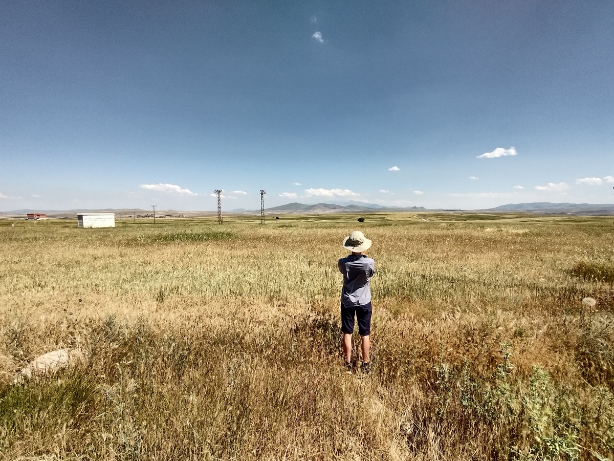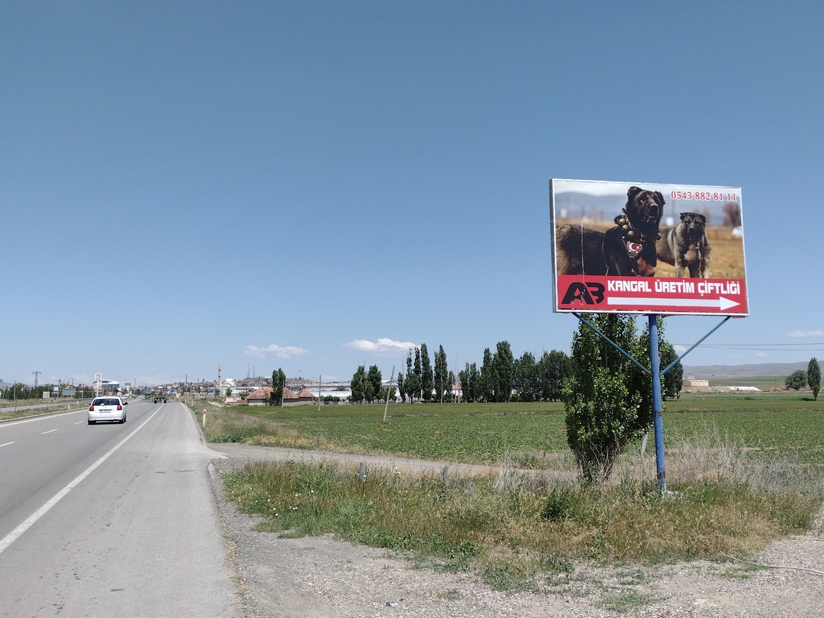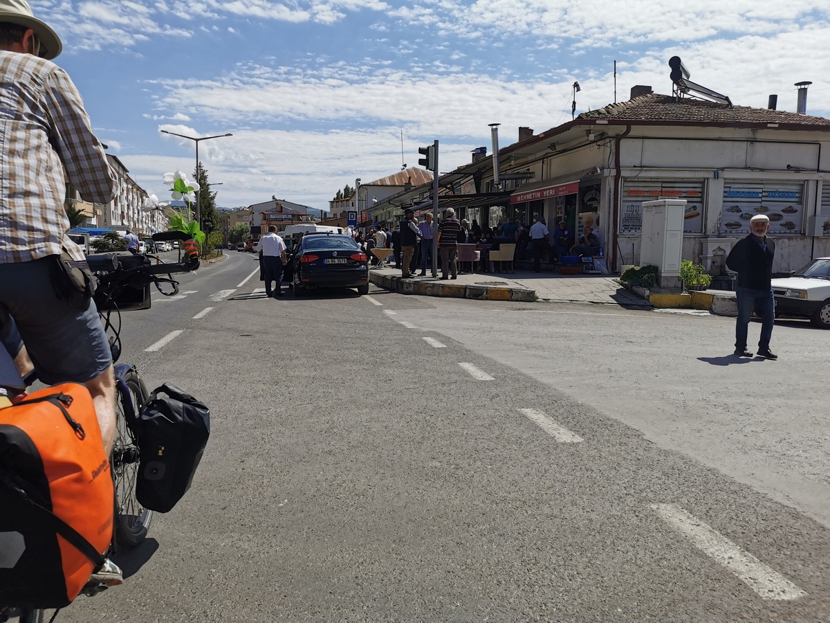 Erst am frühen Morgen gegen vier Uhr fühlte sich eine Gruppe von Hunden offenbar vom Anblick unseres Zeltes gestört und bellte dieses sinnlos an. Julia hörte wenige Augenblicke später ein verräterisches Rascheln und fürchtete um den Kocher, der noch draußen stand. Als sie aus dem Zelt lugte, sah sie einen der Kangals mit der Mülltüte im Maul entfliehen. Mit Oropax schafften wir es noch ein wenig zu schlafen. Am 18. Juni fuhren wir zunächst durch endlose unbewohnte aber landwirtschaftlich genutzte Gegenden. Gegen Mittag erreichten wir den Ort Felanhiye, in dem besonders viele Deutschtürken zu wohnen oder Verwandtenbesuche zu machen schienen. Wir wurden selbst im Supermarkt mehrfach angesprochen, sodass wir von unseren geplanten Einkäufen die Hälfte vergaßen. Dafür lud uns ein älterer Herr jedoch zum Essen in ein Restaurant ein, machte sich aber nach der Bestellung und der beglichenen Rechnung schon wieder aus dem Staub. Eine zweite Einladung zum Mittagessen schlugen wir aus.