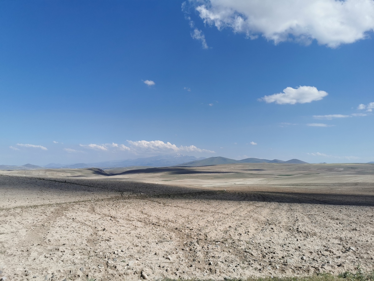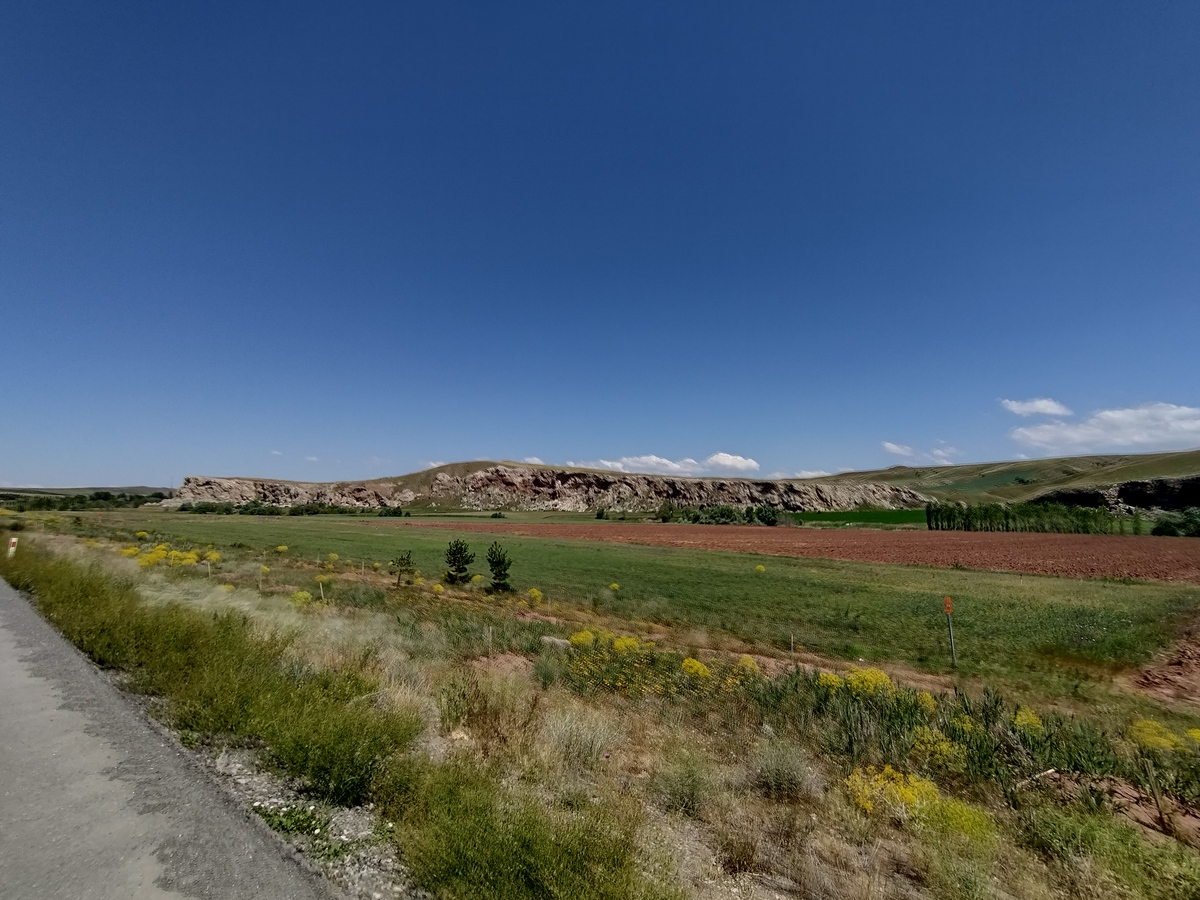 Von Göreme ging es zunächst gut zehn Kilometer bergab bis Avanos, das am nördlichen Rand des „Nationalpark Göreme und die Felsbauten von Kappadokien“ liegt. Dort überquerten wir (mal wieder) den Kızılırmak und wechselten damit vom Nevesehir Plateau auf das Kirsehir Plateau. Wir warfen noch einen letzten Blick hinter uns, aber die bizarren Felsformationen Kappadokiens waren bereits kaum noch zu erahnen. Wir fuhren nun Richtung Nordosten und waren bald wieder von endlosen Weizenfeldern umgeben. Dennoch blieb die Landschaft reizvoll und trotz der späten Abreise, brütender Hitze und einigen extremen Steigungen kamen wir gut voran und schafften es Trabzon über 80 km näher zu rücken. Dabei hatten wir mehrfach einen atemberaubenden Ausblick auf den Erciyes (3916 m), einem der der höchsten Berge der Türkei. Der Vulkan ist mit seinen Ausbrüchen hauptverantwortlich für die Bildung der Tuffsteinlandschaften von Göreme und im weiteren Kappadokien.