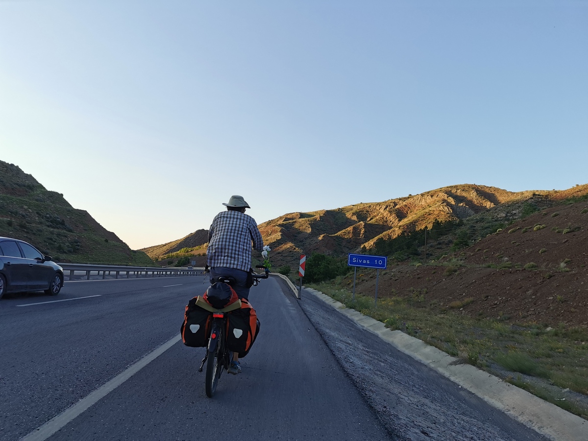 Nachdem wir in einem kleinen Wäldchen am Rande der Fahrbahn dann doch noch einen Rastplatz fanden und dort von einer picknickenden Familie mit Grillgut und Softdrinks versorgt worden waren, gleichzeitig jedoch die Hoffnung aufgegeben hatten, dass wir ein adäquates Nachtlager finden würden, war genug Kraft gesammelt und die Motivation wiedererstarkt, dass wir die letzten gut 30 km bis Sivas nun doch noch schaffen konnten. Als wir auf die D-860 nach Norden abbogen, schlug uns zwar kräftiger Gegenwind ins Gesicht, aber die Landschaft wurde noch einmal attraktiver und so strampelten wir fasziniert durch das schroffe felsige Tal, in dem gerade die Sonne unterging, rollten die letzten Meter bergab in die Stadt hinein und nach 134 km auf den Hof eines modernen Hotels.