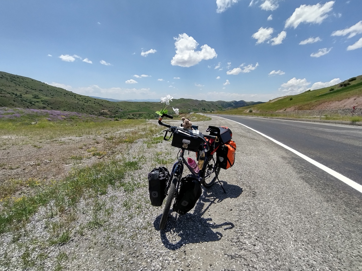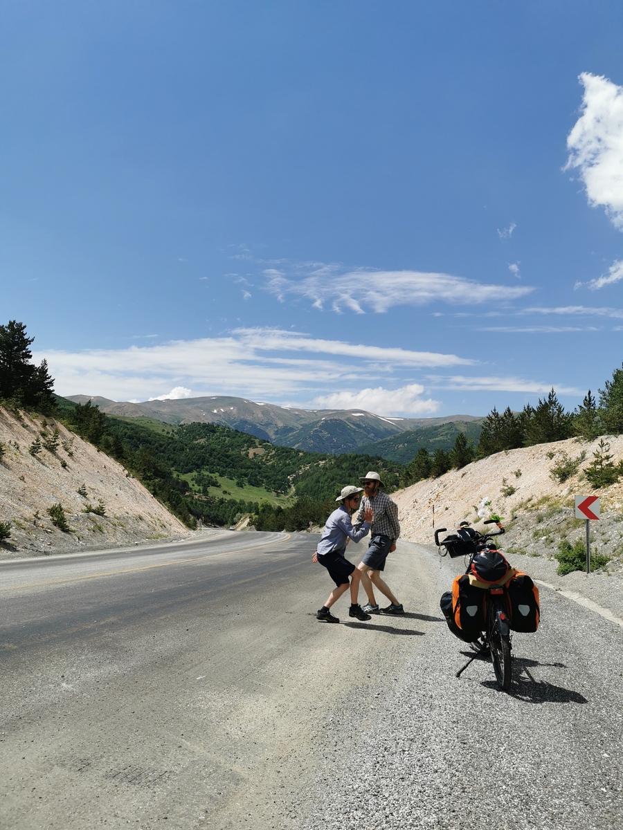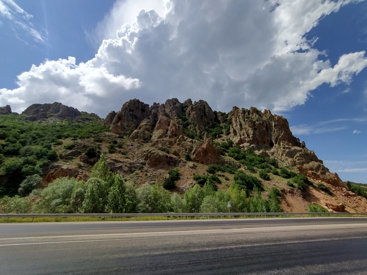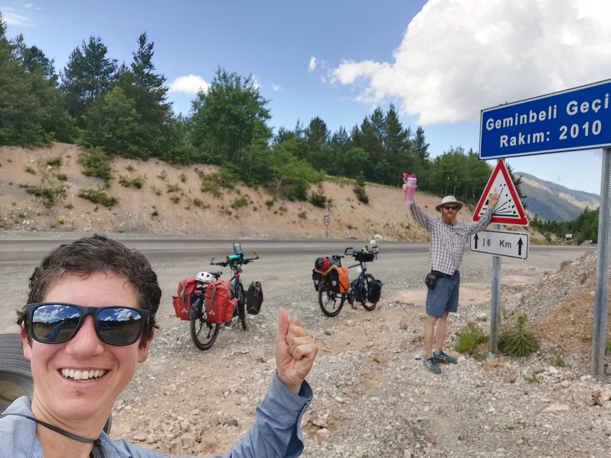 Am nächsten Tag wurde die Umgebung etwas hügeliger und von Seen durchbrochen, war aber insgesamt noch sehr kahl und wie mit Pinsel in Pastelltönen gemalt. Erst als wir bei Zara Richtung Norden (D-865) abbogen, wurden die endlosen Weiten wieder gegen richtige Berge ersetzt und wir erklommen langsam den Geminbeli Pass, was uns unseren nächsten Rekord bescherte: Das erste Mal mit dem Fahrrad auf einer Höhe von 2.010 Metern! Die Landschaft hatte sich wieder komplett gewandelt: grüne Wiesen, vielfarbige Blumen, Laubbäumen und weiter oben Nadelgehölze. Die Abfahrt war etwas hoppelig und führte uns wieder durch kantige Felsen, in denen wir auch einen gigantischen Überhang entdeckten, der im Begriff war sich in eine Höhle zu verwandeln. Bei aller Bewunderung bemerkten wir erst spät, dass sich wieder einmal Gewitterwolken hinter uns auftürmten. Wir bogen bald ins Tal des Degirmen ab und blieben damit den autobahnähnlich ausgebauten Schnellstraßen treu.